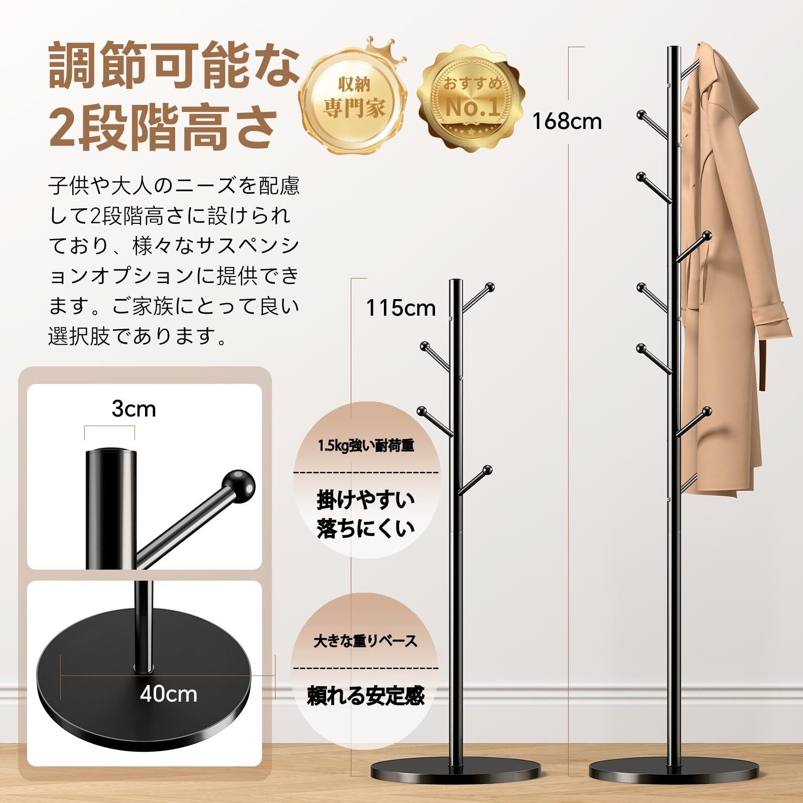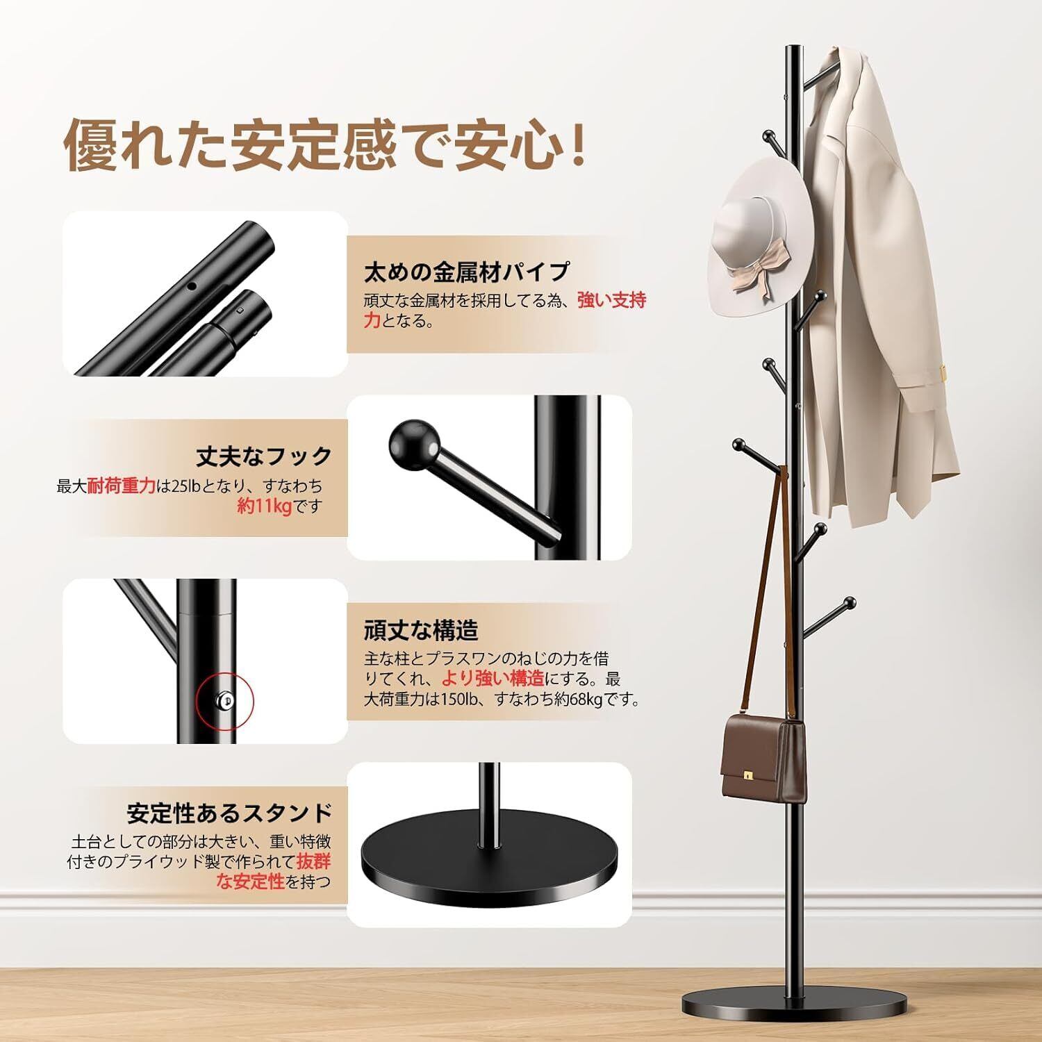 【超耐荷重・安定感のある円盤ベース】重さが約1.5kgだと、やや重めの円盤ベースに設計されており、重心がしっかりと支え、重めのコートやカバンを掛けても倒れにくく、安心して長くご使用頂けます。抜群な安定性だからこそ、荷重力も大幅に上がり、150LBS、68KGまで達してます