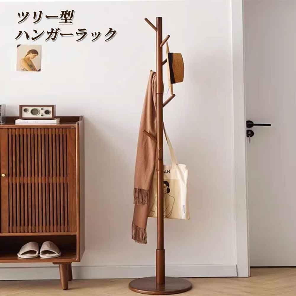 ポールハンガー 木製 コートハンガー ハンガーラック 8つフック 3段高さ調節可能 スリム おしゃれ 衣類収納 倒れにくい土台 組立て簡単 洋服ラック (ブラウン)