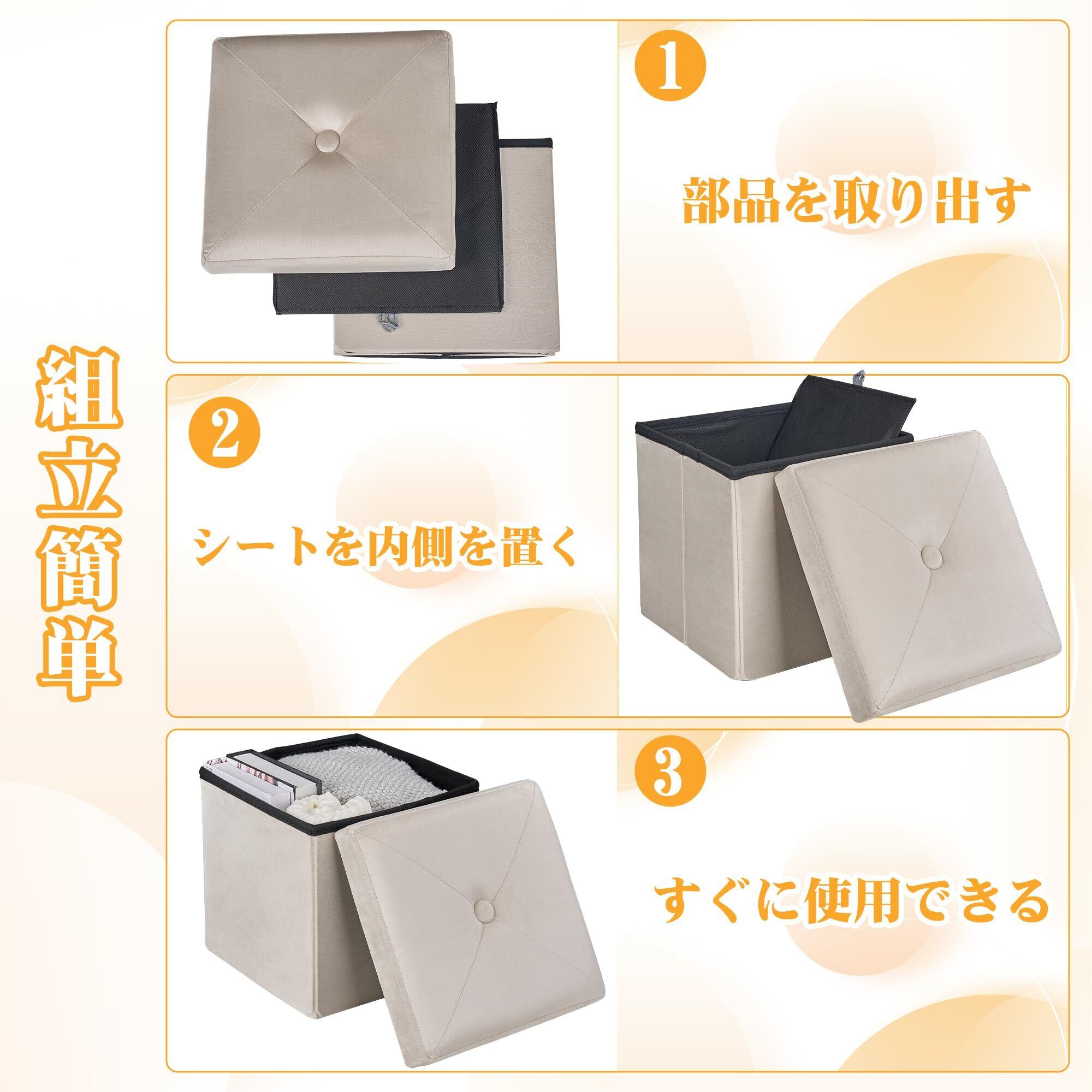【折りたたみと組立簡単】この収納スツールは説明書が要らず、折りたたんだ部分を広げるだけですぐに使用できます。使用可能までには数秒しかかかりません。使用していない時、折りたたんで隙間に置き、スペースを取りません。