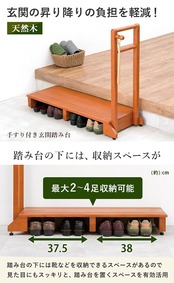 玄関や段差がある場所の上り下りが楽になる玄関踏み台。手すりが付いているので、安定して乗り降りすることができ、ひざへの負担を減らし転倒防止にもなります。高級感のある天然木は玄関のインテリアにも馴染みやすく、カバンやステッキ、杖を掛けられる便利なフック付きで台の下には靴も収納可です。ペット用としても活躍します。