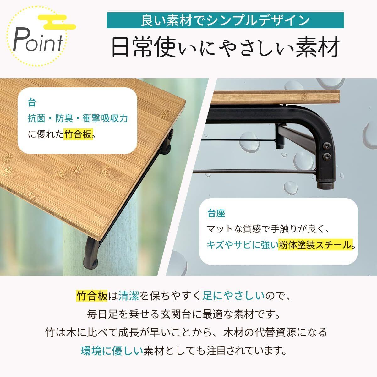 こちらの玄関台は竹を使用しており、強度と耐久性に優れています。表面は滑りにくい処理が施されており、安全にご使用いただけます。毎日の出入りがより快適になり、転倒のリスクを軽減します。