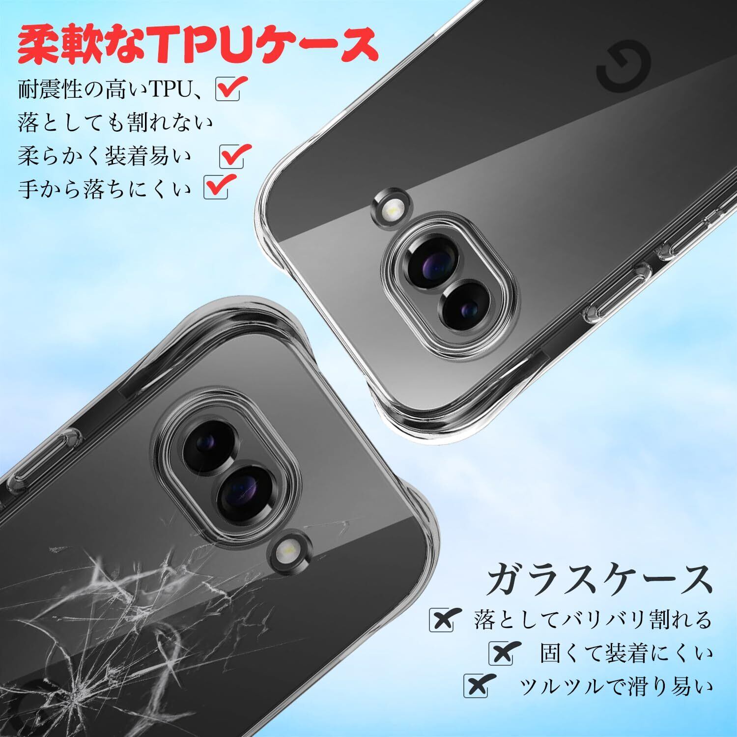 「Google Pixel 9aケース」は、透明TPU素材を使用しており、デザインを強調しつつ、あなたのスマートフォンを衝撃からしっかり守ります。柔軟性があり、スリムで軽量なため、持ち運びも快適。ワイヤレス充電にも対応しており、日常使いに最適な仕様です。