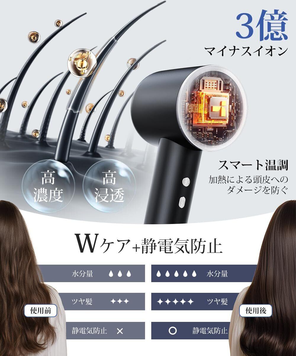 「ドライヤー 大風量」は、1400Wのパワフルな風量を誇り、忙しい毎日の中でも時短で美しい髪を実現します。3億マイナスイオンの力で髪の静電気を抑え、しっとりとした美髪に導くヘアドライヤーです。最新の設計に基づき、より効率的な乾燥を可能にします!