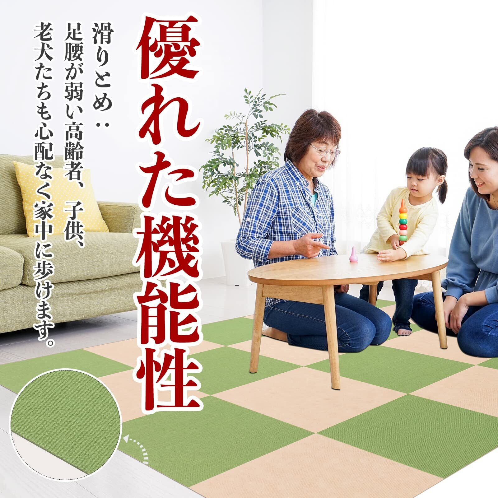 3、【優れた機能性】滑りとめ:表面4mm厚の高品質ポリエステルは滑りとめの性能をアップさせます、足腰が弱いご老人や子供も心配なく家中に歩けます。保温:適度な通気性と保温性があるため、寒いときフローリングや床の寒さと結露の心配もありません。床暖房対応できます:冬の大人気!ほとんどのおうちの床暖房には対応できます、安心して使ってください。防音対策:防音性が優れており、お部屋の音も響きません。床暖房対応、冬にも暖かく楽しい!適応性が広い:高品質の材質で作られマットは、いろんな場所で使える!①リビング。②玄関。③台所。④和室(洋式)部屋。⑤廊下。⑥ペット用。⑦子ども部屋。⑧オフィス。⑨保育園や施設など。お客様の都合によって、必要な場所に好きなだけ、使ってください。