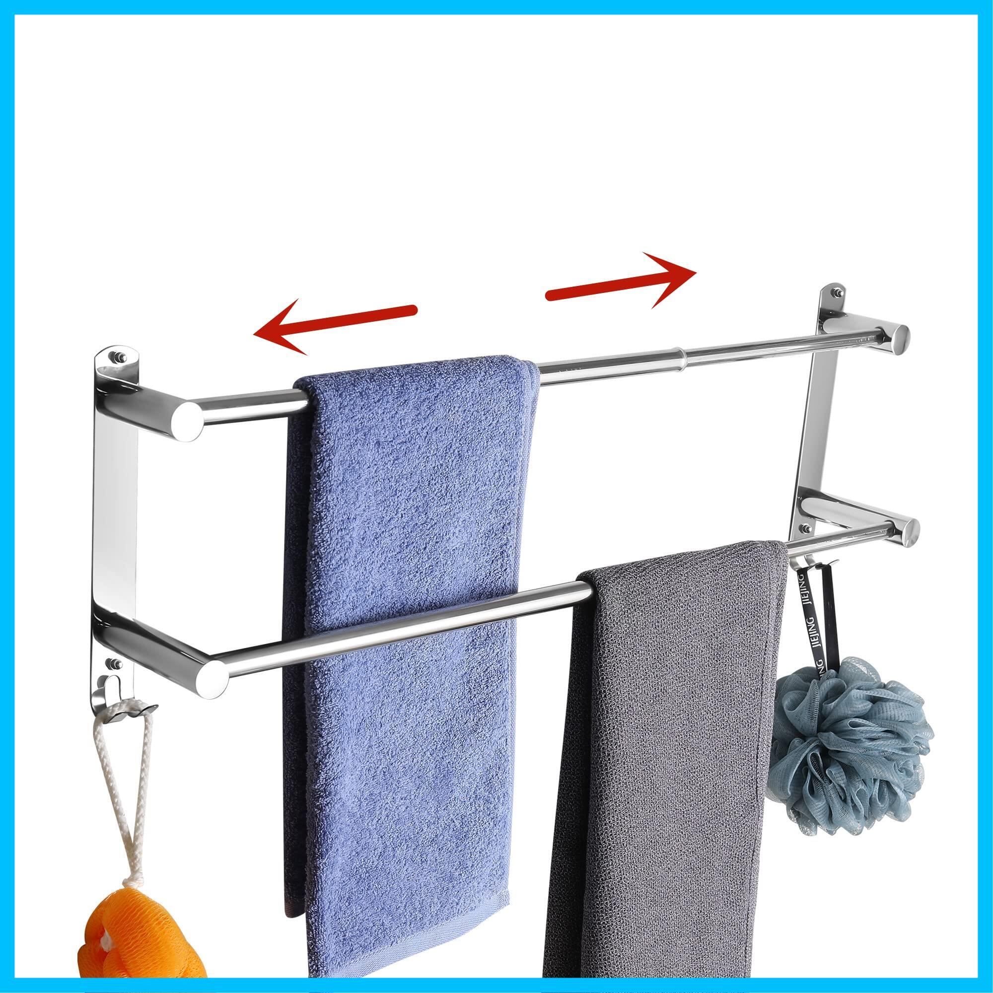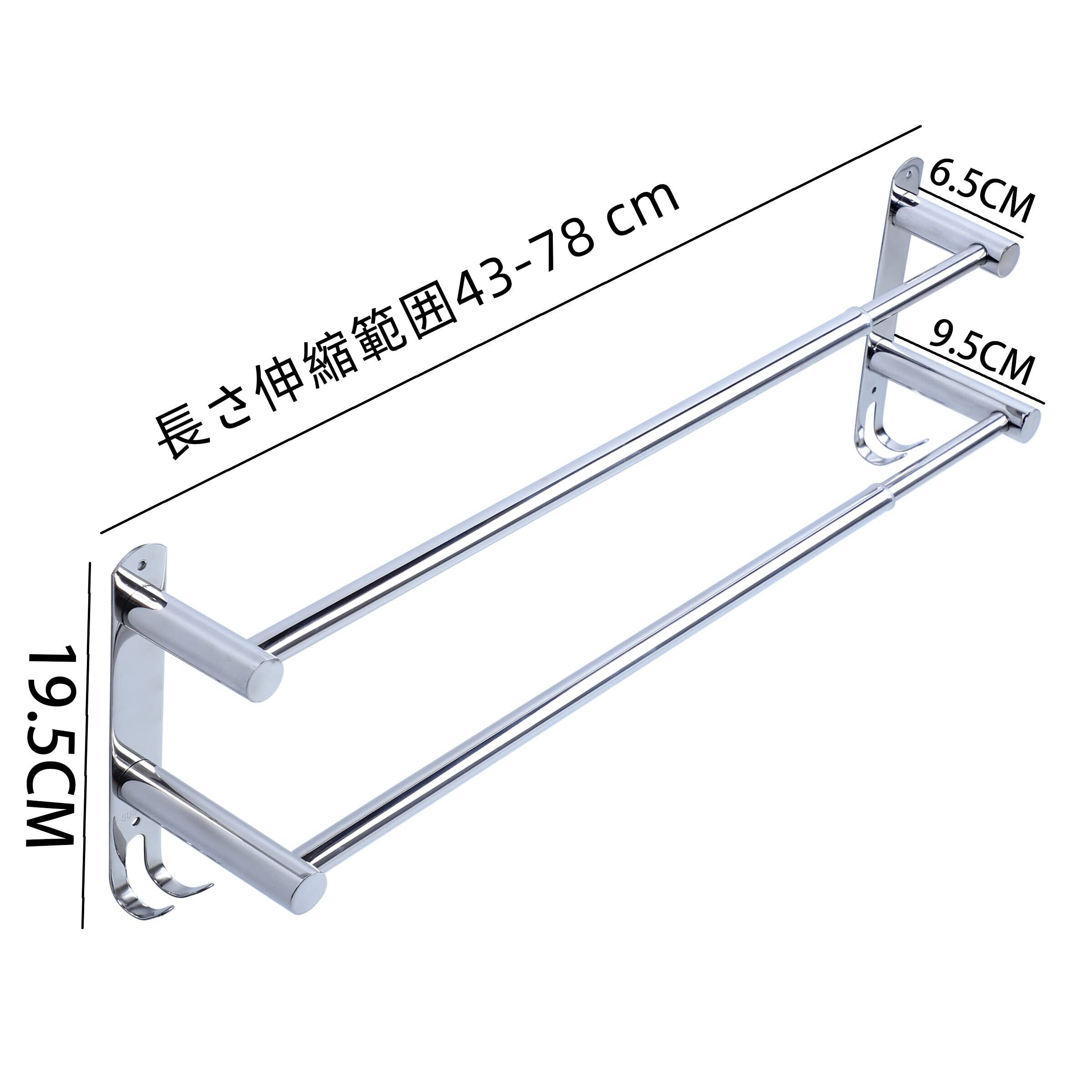 CAXIMSY 伸縮可能タオル掛け 洗面所ステンレス タオルラック 粘着 タオルハンガー キッチン バスルームタオルかけ【伸縮可能な長さ43-78cm】 (シルバー2層)