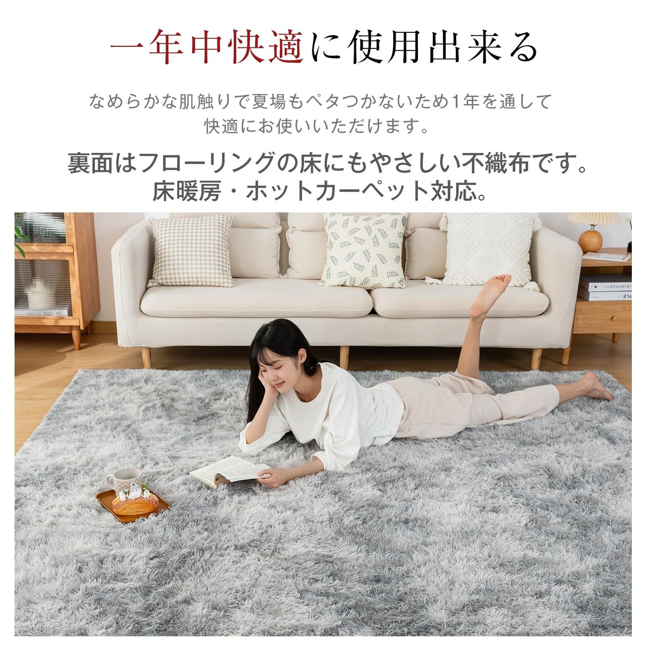 【オールシーズンカーペット】このラグの毛足は、通気性が良く、速乾性にも優れたマイクロファイバーを採用し、踏み心地は柔らかい、夏はサラッと快適に、冷房機器との併用で快適に過ごせます。耐熱加工を施しているので冬はホットカーペットや床暖房の上に敷いてもお使いでき、フワフワと暖かく、居心地がよくなります。