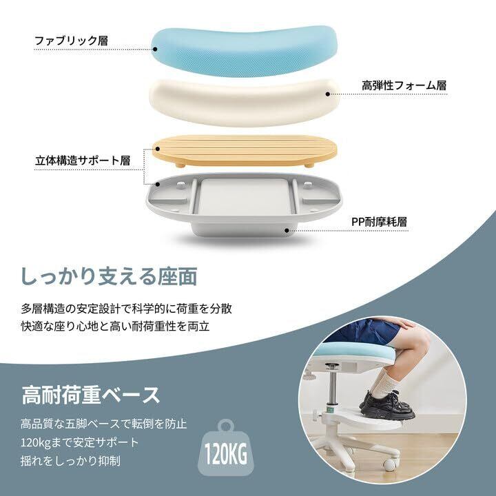 【快適な座り心地を追求】8cm厚の高弾力クッションが体をしっかり支え、ふんわり快適に座れます。通気性に優れたナイロンメッシュで蒸れにくく、長時間でも快適。学習椅子として設計されたこのイス 子ども用には、7°のロッキング機能も搭載され、座り疲れをやわらげます。