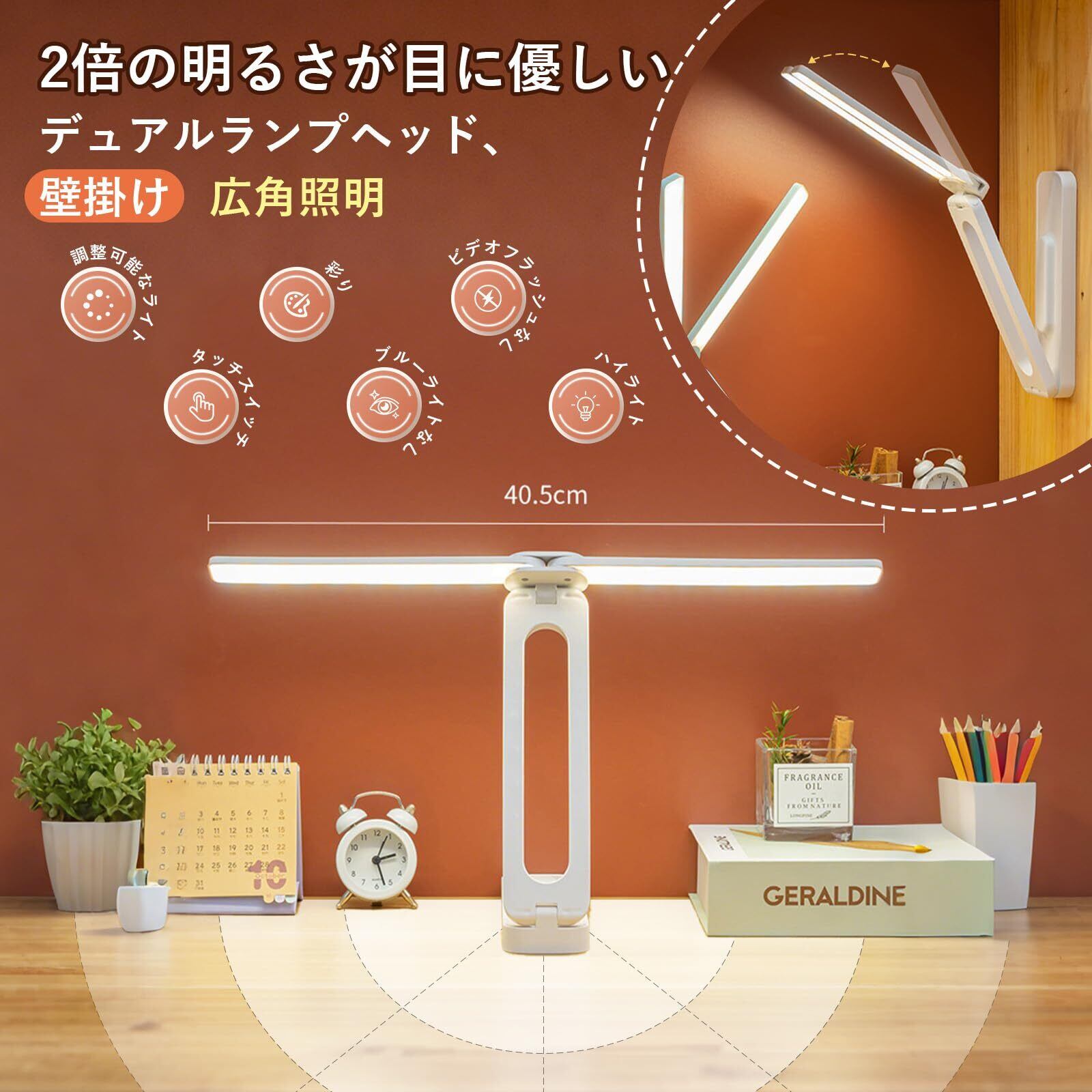 【 広範囲照明 & 多用途対応】180度回転可能な2つのランプヘッドで、広範囲を均一に照らします。読書、学習、手工芸、絵画など、さまざまなシーンで活躍。仕事や勉強に最適なだけでなく、緊急時の照明としても頼れる存在です。