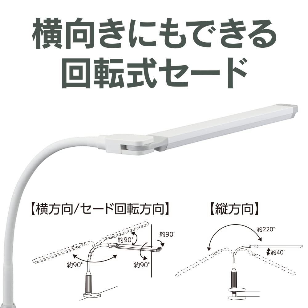 【 特 長 】 LEDデスクランプ クランプタイプ 広範囲を明るく照らす長いセード 軽くまわすだけでしっかり固定(テーブル厚約5~60mmまで対応) 横向きにもできる回転式セード フレキシブルアーム採用
