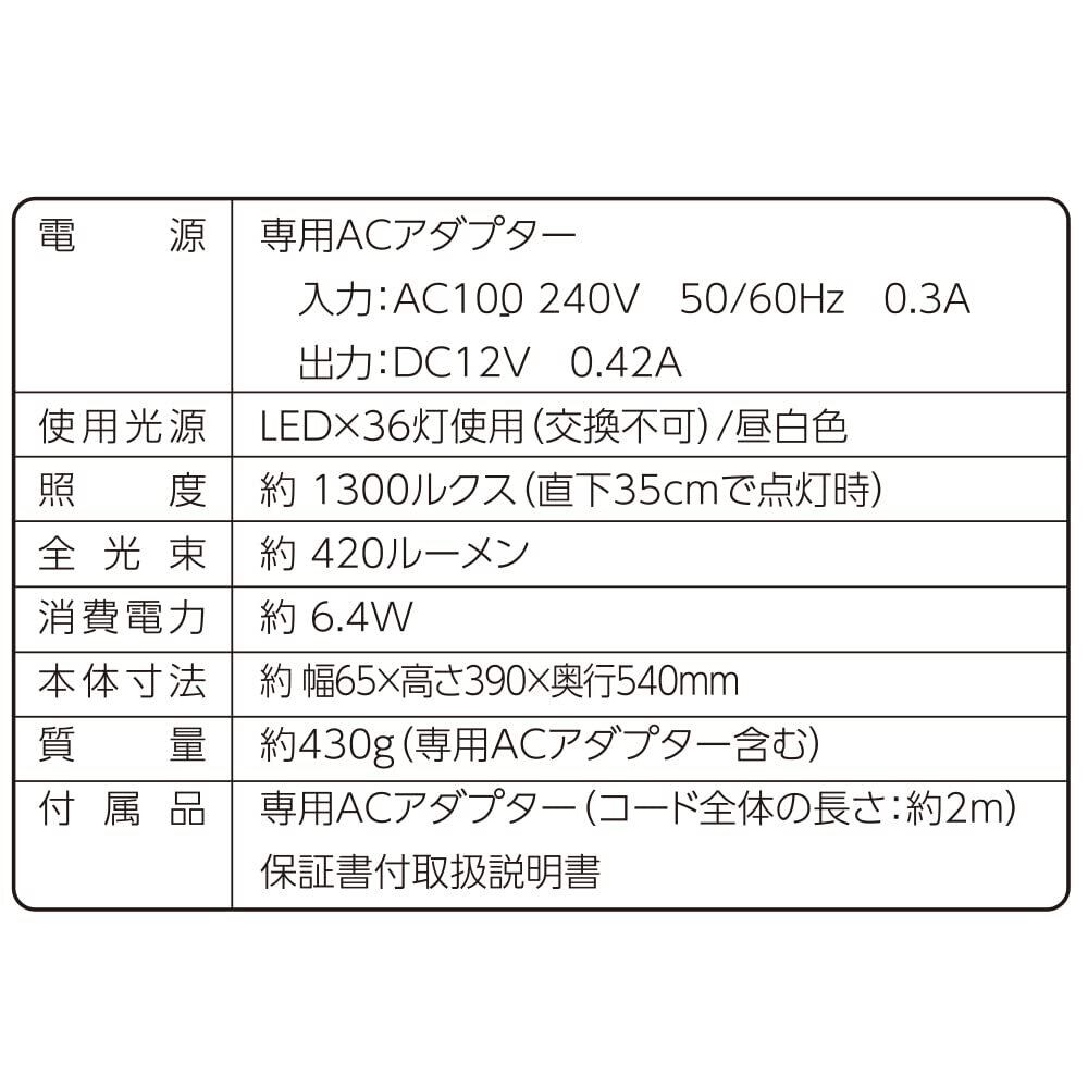 【 仕 様 】電源:専用ACアダプター 入力…AC100-240V 50/60Hz 0.3A、出力…DC12V 0.42A使用光源:LED×36灯使用(交換不可)/昼白色照度:約1300ルクス(直下35cmで点灯時)全光束:約420ルーメン消費電力:約6.4W本体寸法:約幅65×高さ390×奥行540mm質量:約430g(専用ACアダプター含む)付属品:専用ACアダプター(コード全体の長さ:約2m)、書付取扱説明書
