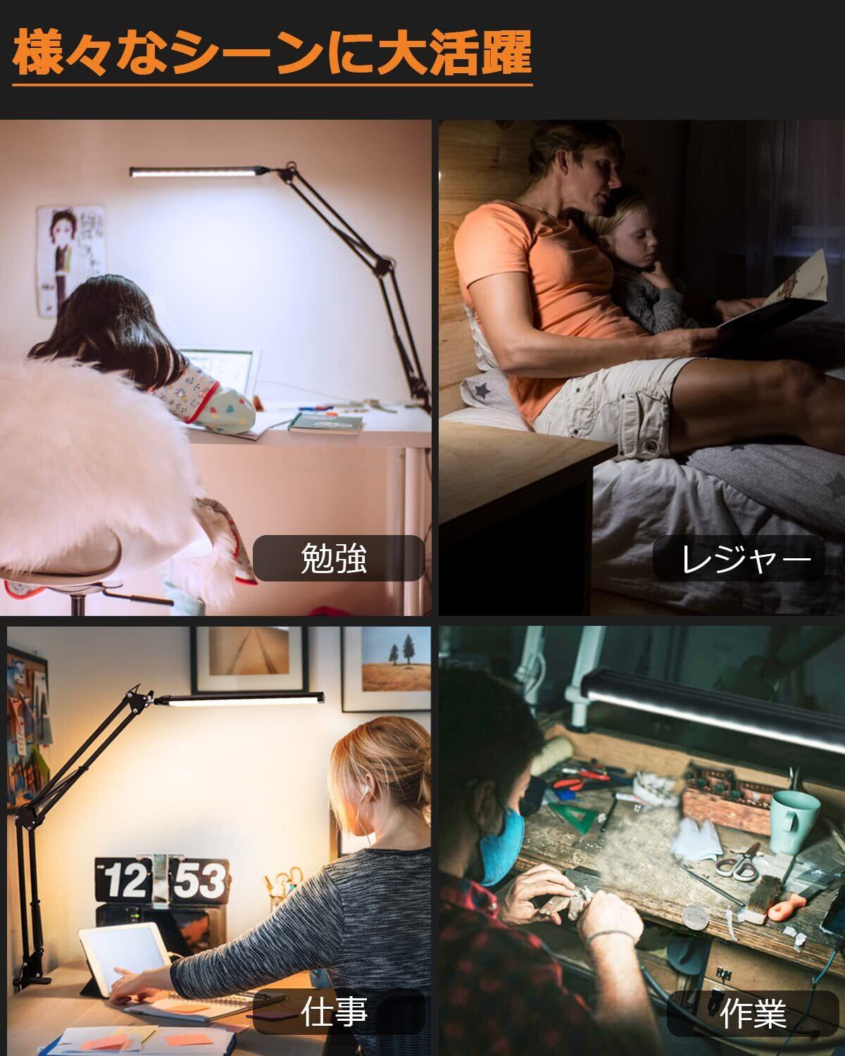 【アーム構造・省スペース】LEDライトは頑丈な高品質アルミ合金製クランプを採用し、最大厚さ5cmのデスクに挟むことができます。アーム上部の長さは約380mmであり、光の方向を任意に調整できるため、全方向の照明を実現し、デスクトップスペースを最大限に活用し、省スペースです。使わない時はフル折りたたんでデスクスペースを有効活用できるため、狭い場所でも快適に使えます。