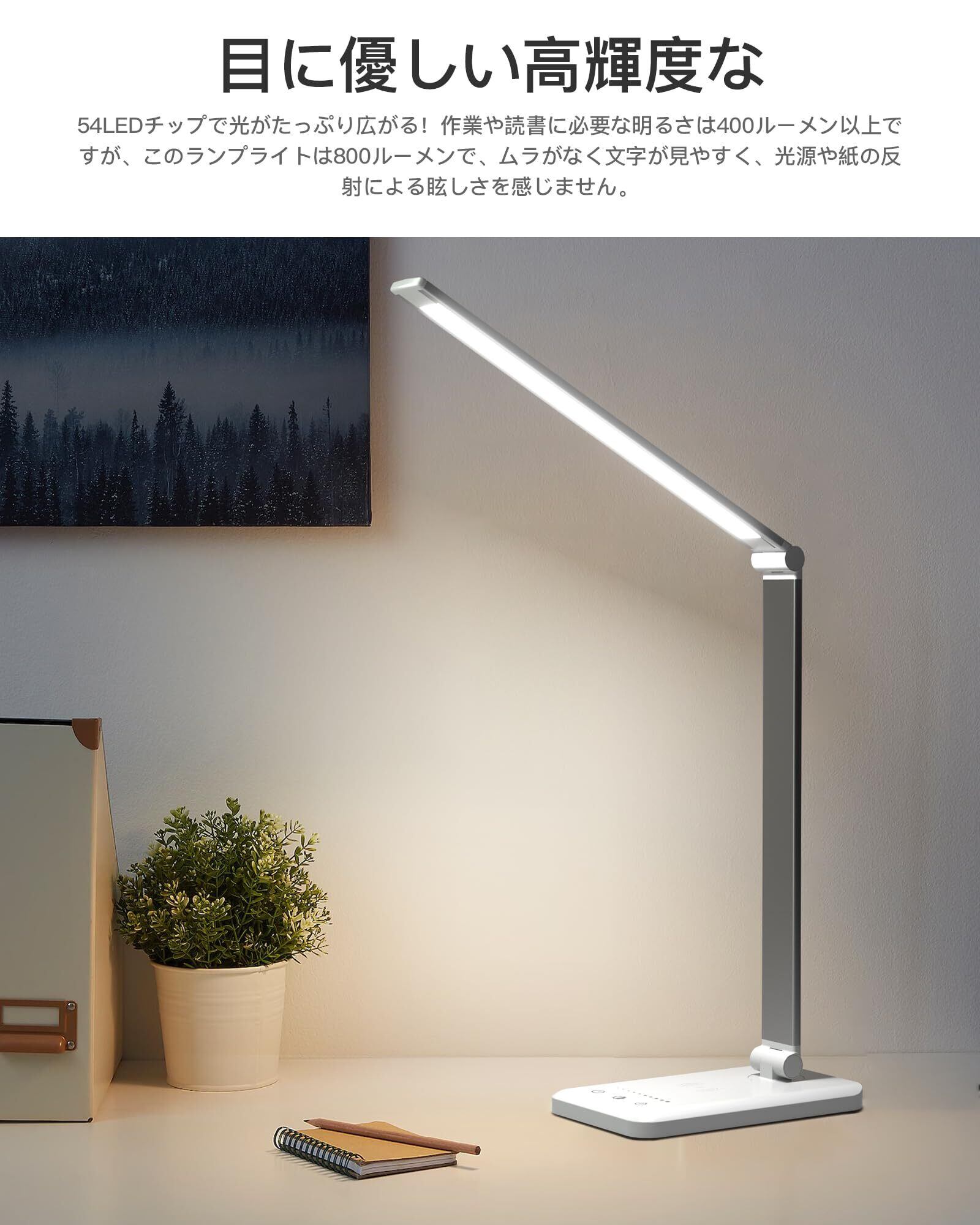 このデスクライトは、10段階の明るさ調整と5段階の色温度調整を備えており、自分好みの光環境を容易に整えることができます。昼光色から電球色まで、シーンに合わせた光を楽しめるのが魅力です。特に勉強や読書の際に快適な明かりを提供します。