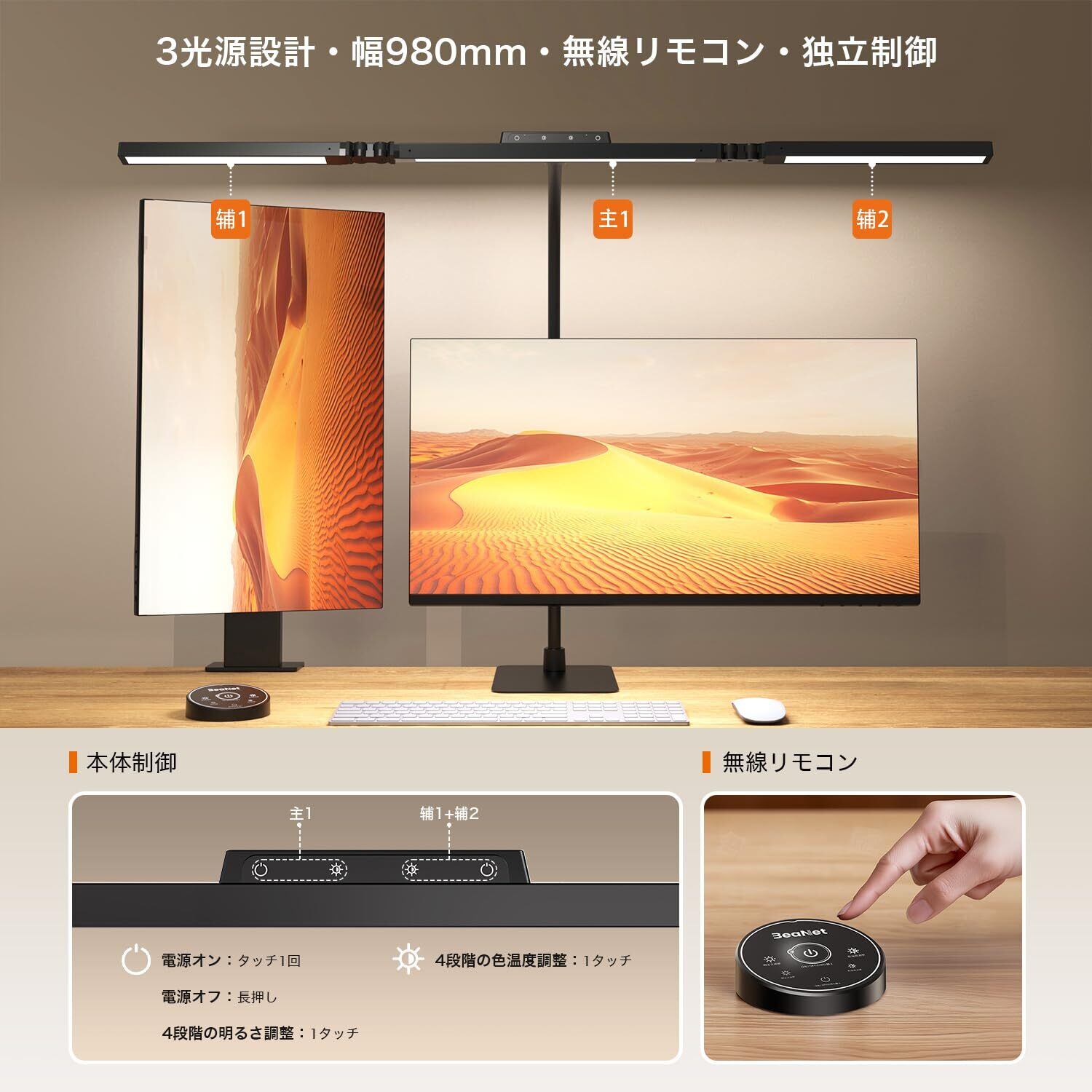 BeaNet デスクライト LED 「幅980mm・大型ベース・3光源Max+版・無線リモコン・24W・独立制御・2000Lx」 4段階調光調色 環境補助光 電気スタンド 「PSE認証済」幅広 スタンドライト 多角度調節 卓上ライト 目に優しい 仕事/勉強/読書 ブラック BNT-DEL08B(T型 )
