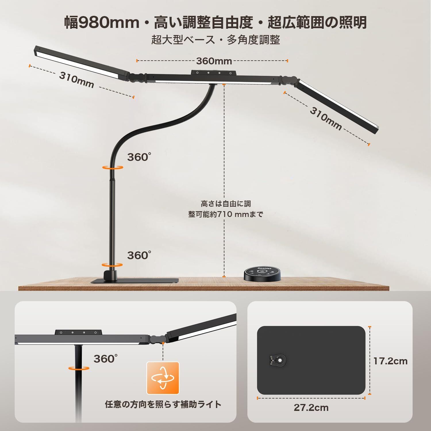 BeaNet デスクライト LED 「幅980mm・大型ベース・3光源Max+版・無線リモコン・24W・独立制御・2000Lx」 4段階調光調色 環境補助光 電気スタンド 「PSE認証済」幅広 スタンドライト 多角度調節 卓上ライト 目に優しい 仕事/勉強/読書 ブラック BNT-DEL08B(T型 ) | Lulu