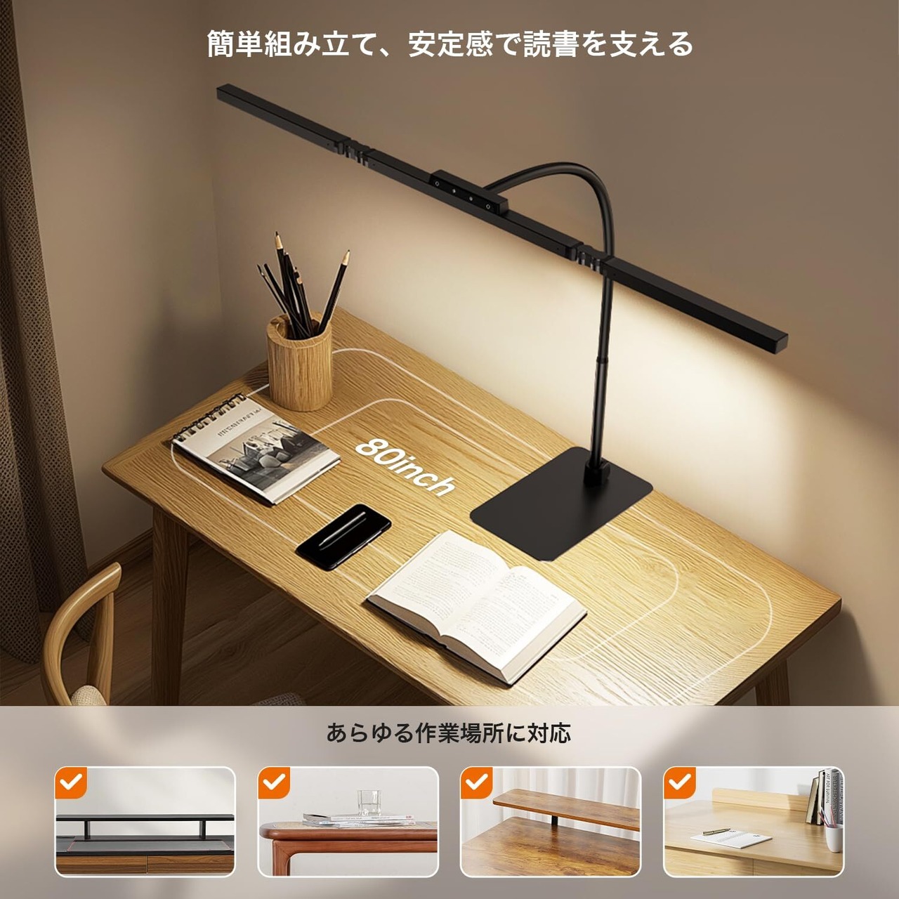 【岩のように堅固で・地域全体を照らす】大型の加重ベース設計により、デスクの厚みを考慮する手間が省け、どんなデスクトップにも適しています!底面には滑りのないパッドが付いており、デスクトップを傷つけません。ピアノデスクライトとしても使用可能。LED電気スタンドは明るく強力で、高さを自由に調節できます、省スペース。超広角照射の幅広ヘッドで、光の向きを自由に調整できる、卓上全体を明るく照らします。ランプヘッドは放熱性の高い高品質アルミニウム合金製。