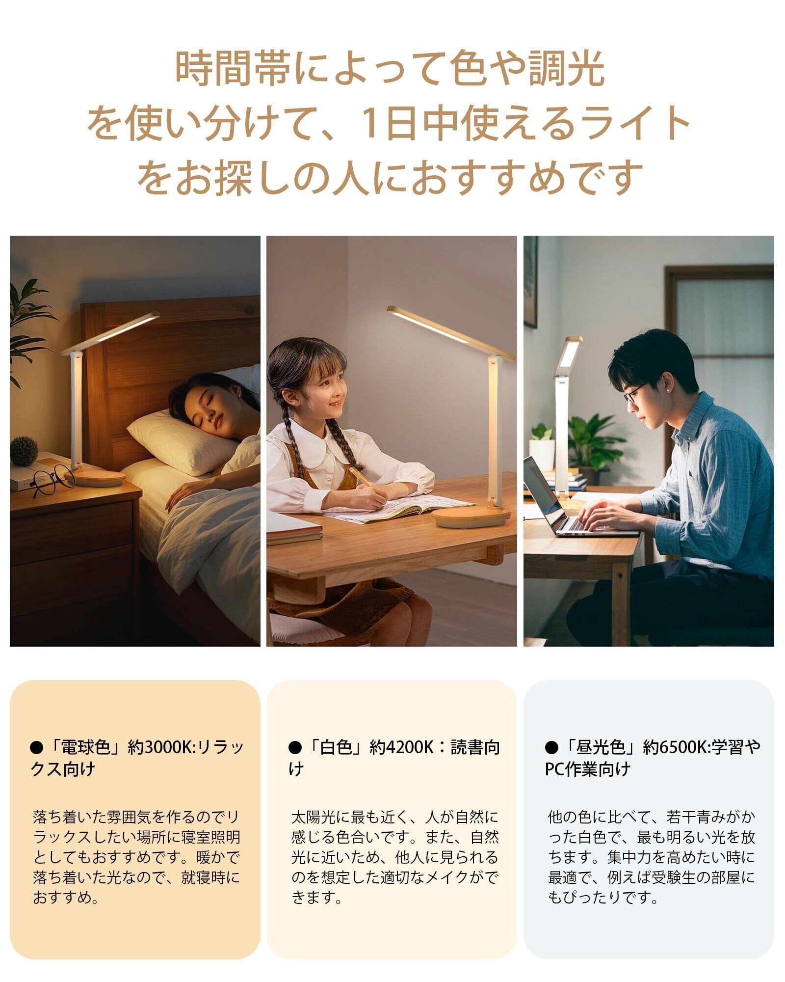【9段階調光・3段階調色スタンドライト】2024年の新型LEDデスクライトて、お好みの明るさを9段階に調節できます。読書灯は読書、仕事、リラックスタイムなどに適していっます。シーンに合わせて、最適な照明を自由に設定できる。勉強 ライトとして、目に優しく、長時間使っても快適な明るさを見つけることができる電気台卓上です。そして、スタンドライトは電球色(3000 K)、温白色(4500 K)、昼光色(6000 K)の3種類の色温度を選択することができます。そして、デスクライトッチに軽く触れるだけで点灯操作ができます。ライト ledのキーを長押しすると電気を消すことができます。これは、「+」と「-」をタップしたり長押ししたりすることで簡単に明るさを調整できる卓上ライトです。仕事でも休憩でも、さまざまなシーンに最適な照明環境を備えたデスク 用 ライトです。
