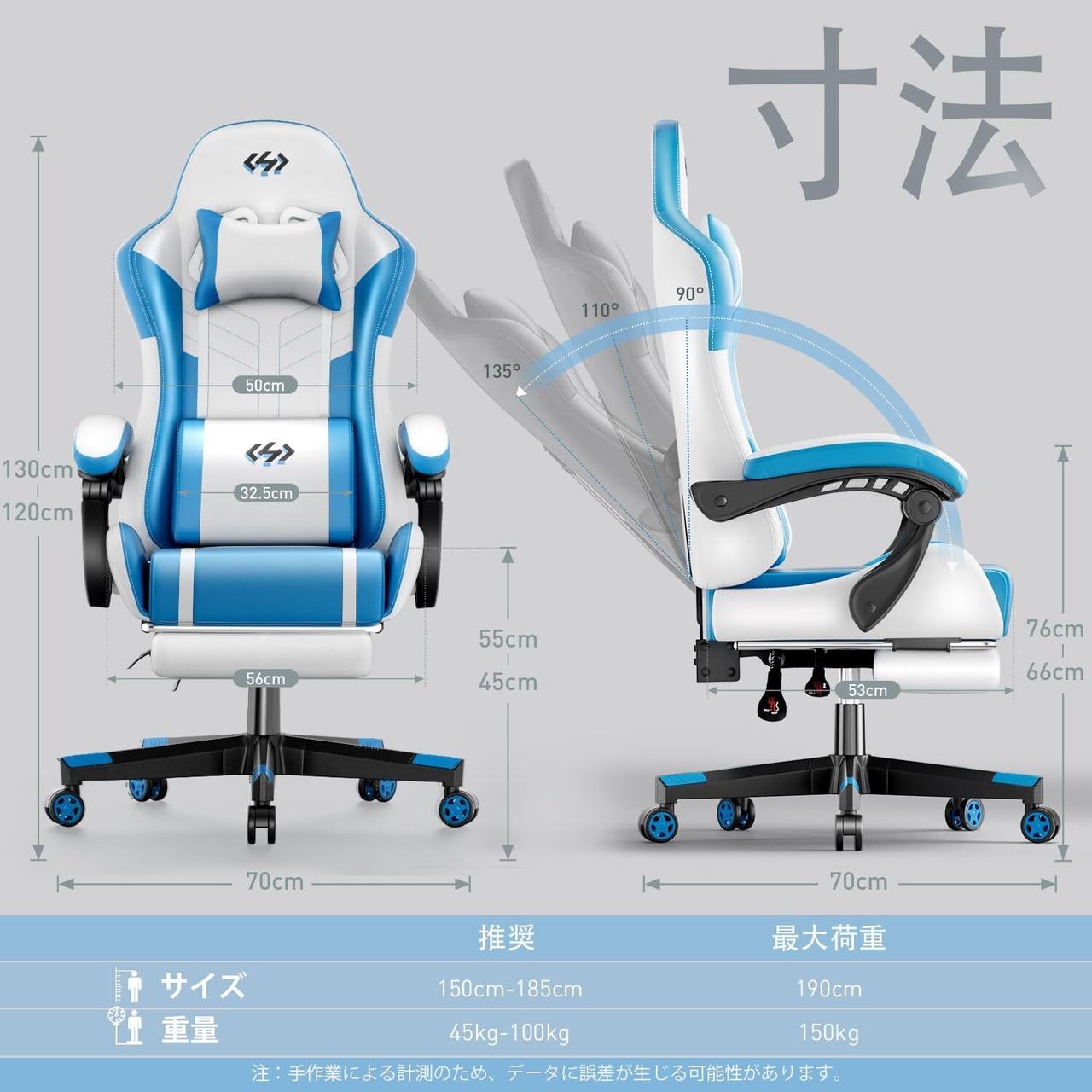 HLFURNITURE ゲーミングチェア ゲーミングチェア デスクチェア リクライニングコンピュータチェア ハイバックレスト ヘッドレスト付き ランバー アームレスト 高さ調整 PUレザー フットレスト付き 簡単な組み立て (青と白)