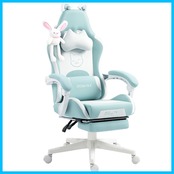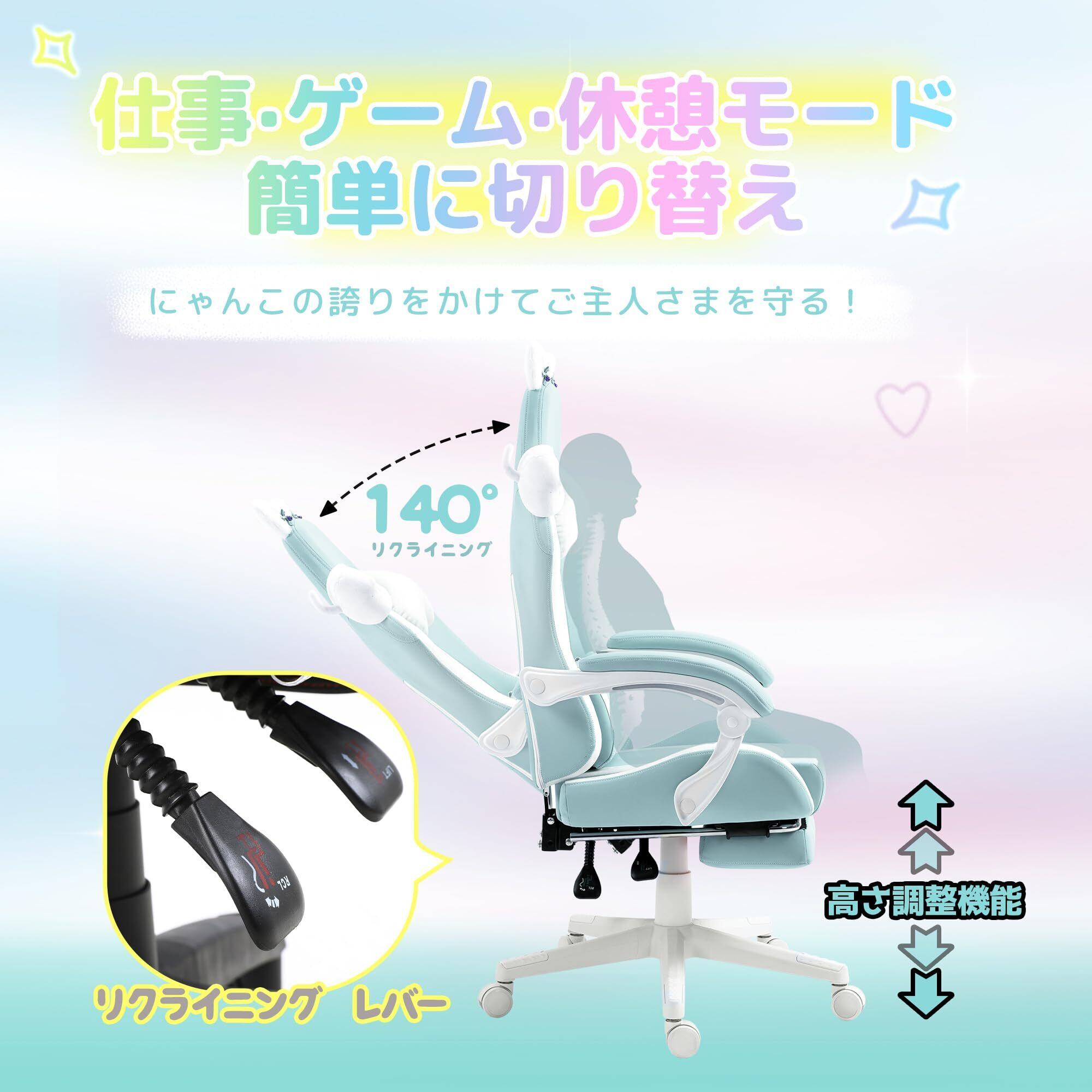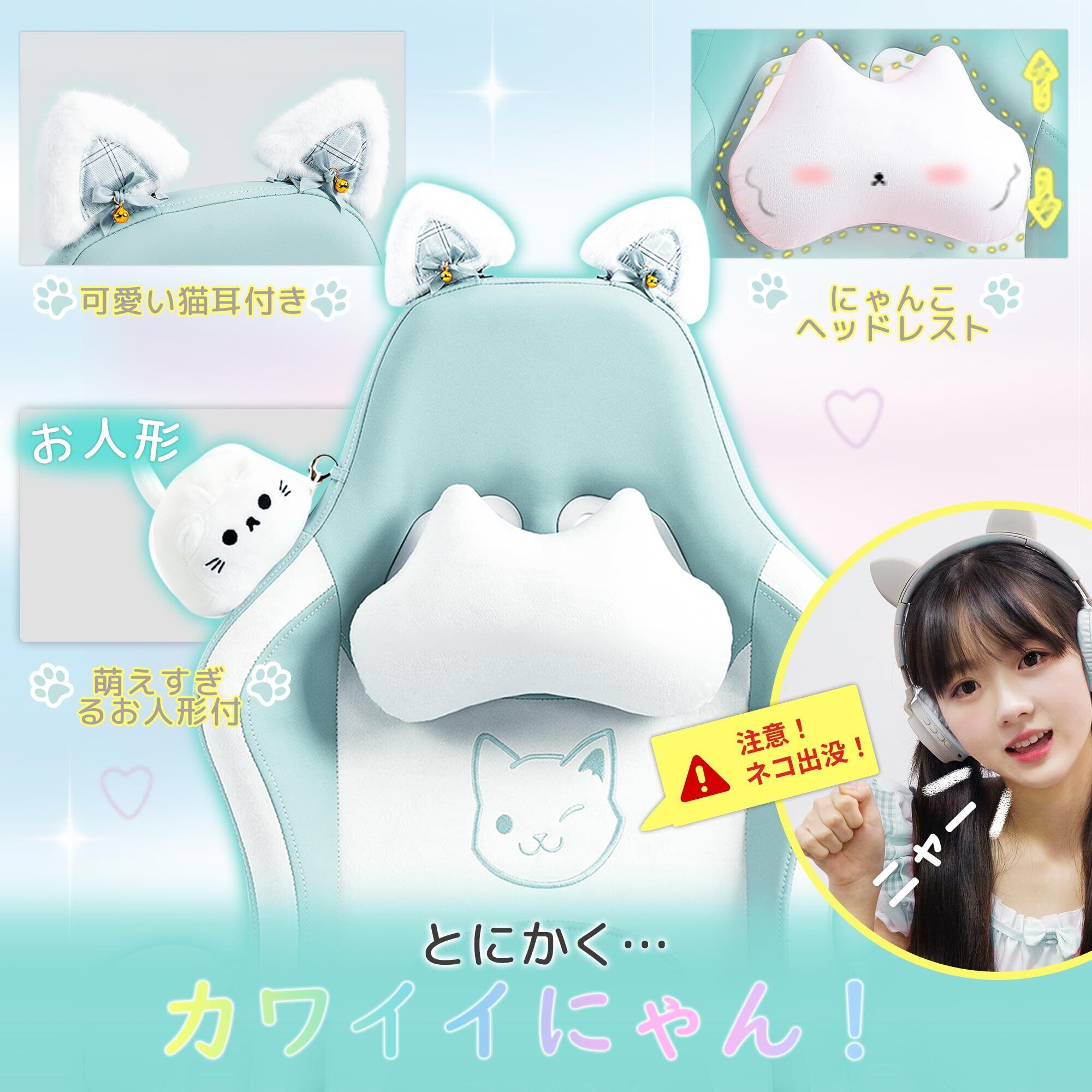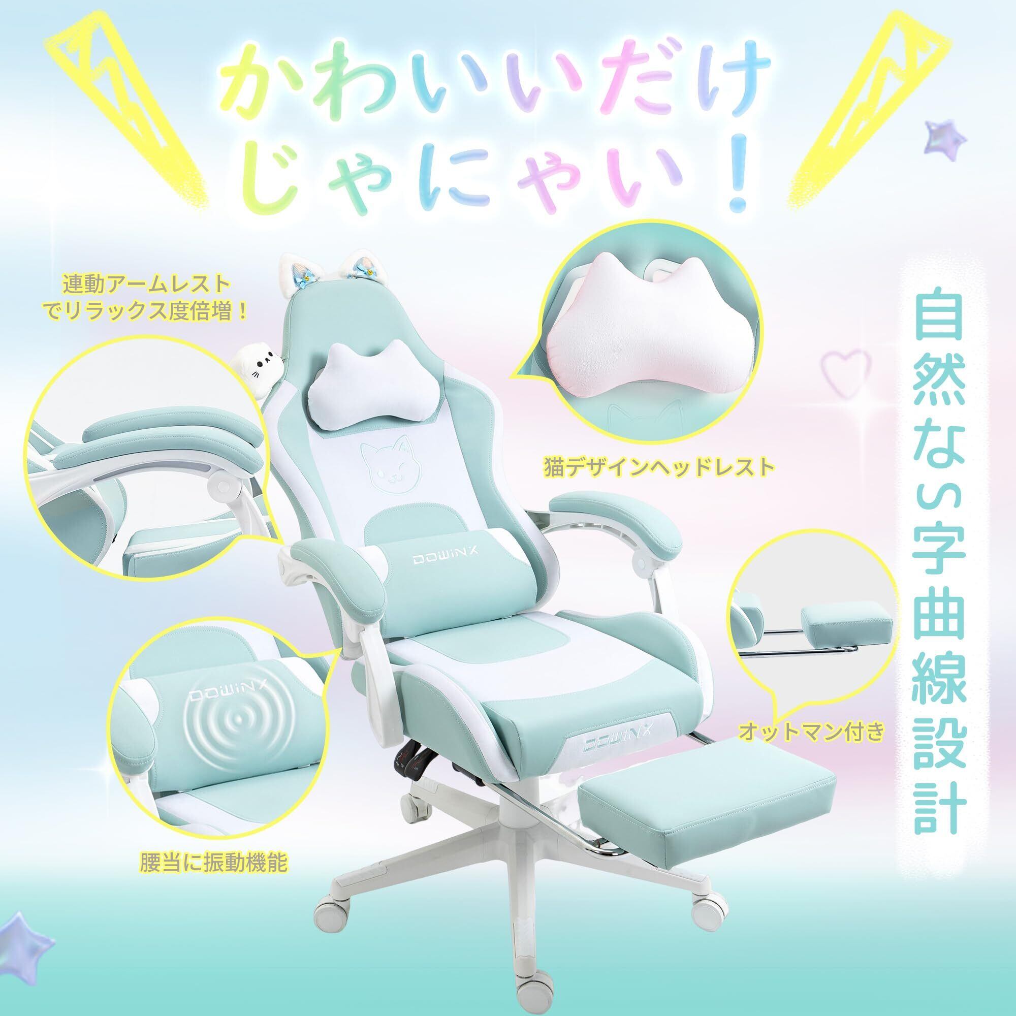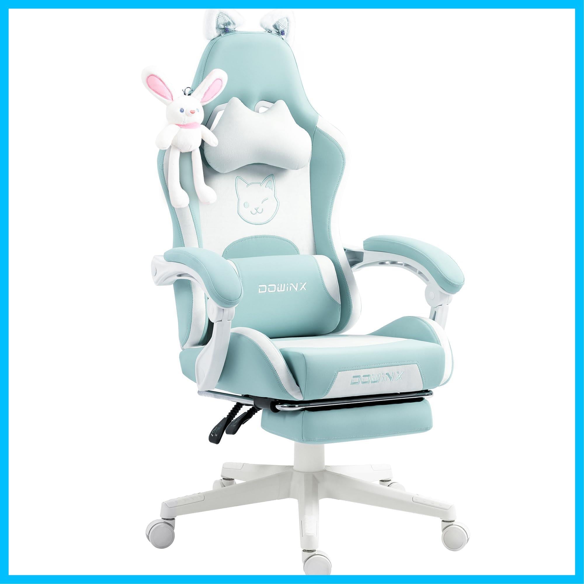 Dowinxのゲーミングチェアは、ほんのり水色と白の愛らしいデザインに、猫耳のヘッドレストと鈴付きのヘアピンがポイントです。ゲームをしながらも、おしゃれで猫好きなあなたの気持ちを満たしてくれる一品です!
