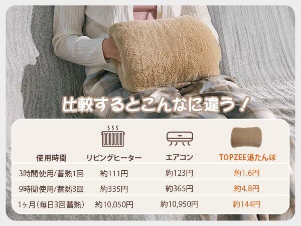 【TOPZEE 充電式湯たんぽ|体も心もあったかに、冬の温もりを再定義】従来の湯たんぽの概念を超える即効性。充電開始後わずか10秒で温感を実現。この冬は省エネ、節電で暖かく!! ふわふわカバーにポケットつきでさらに温かい。手を入れるあったか蓄熱式湯たんぽ。 ●一日一回の蓄熱電気代約11.78円(1Kwh単価31円で算出) ●毎日使っても一ヶ月わずか63円 ●表面温度MAX70℃ ●自動停止機能安心・安全 ●蓄熱時間8-12分(室温などにより時間は変動します)●温度持続4~12時間(最大時間はお布団の中に入れた場合 ●お湯の入れ替え不要 eco湯たんぽは面倒なお湯の入れ替え不要 繰り返し蓄熱して使えるeco湯たんぽ ●急速蓄熱・長時間あったか 。TOPZEEが提案する新しい冬の過ごし方 "充電するだけで、一日中続く至福の温もり"。