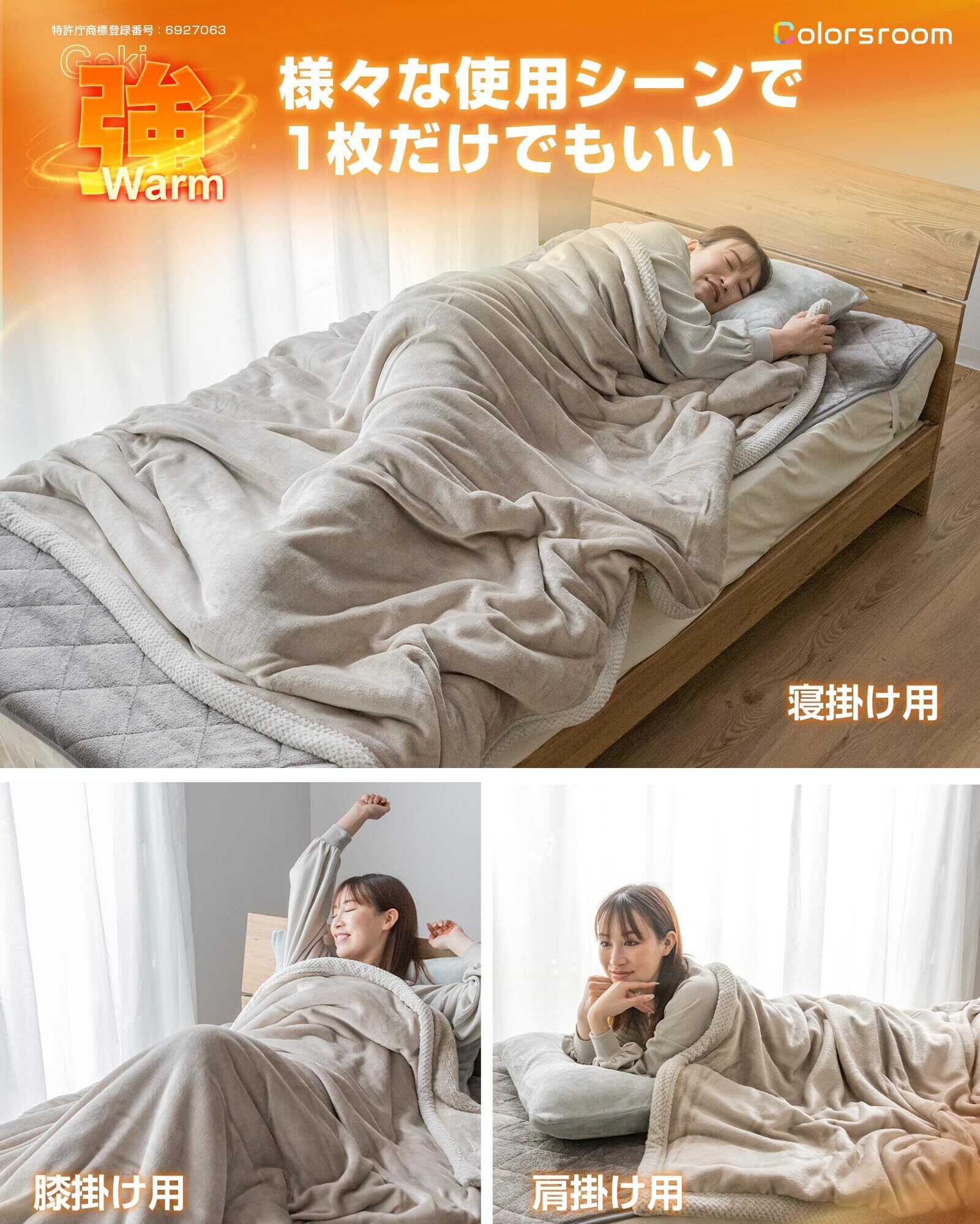 Colorsroomの毛布は、シングルサイズ140×200cmで、冬の寒さからしっかり守ってくれます。3Mシンサレートを全体に使用した六層構造が、体温を逃さず暖かさを保ちます。柔らかなフランネル生地は、肌触りが心地よく、リラックスした眠りを提供します。グレージュのシンプルで落ち着いた色合いは、お部屋のインテリアにも溶け込みます。