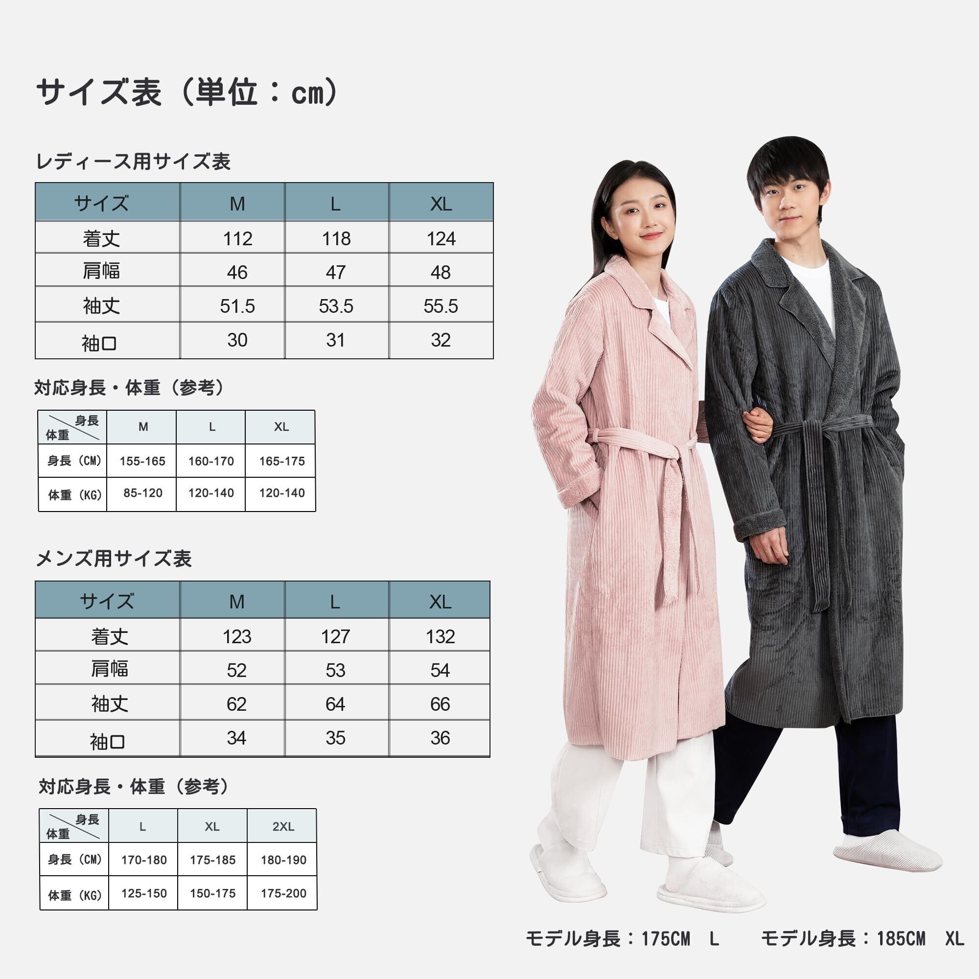 M~2XLサイズのバリエーションで、男女問わず着用が可能です。ジャストフィットのサイズ感で、リラックスしたあたたかさを楽しめます。家でのくつろぎタイムや、在宅勤務にもおすすめのガウンスタイルです。