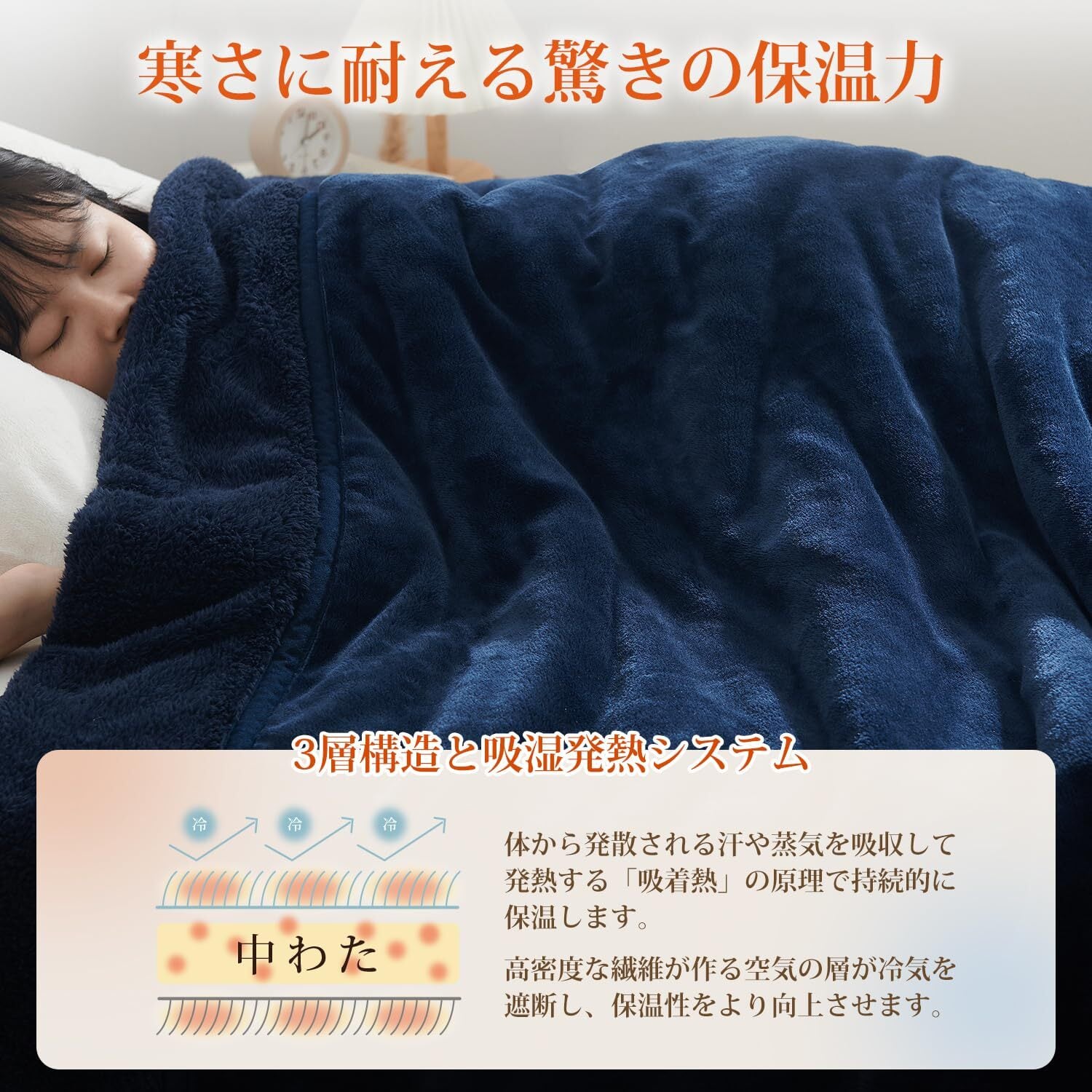 「優れた保温性」吸湿発熱による優れた保温性で、体から発散する汗や水分を吸収し、ムレや不快感を軽減します。寒い夜もぽかぽかと暖かさが続き、毛布に包まれた瞬間から深く快適な睡眠へと導きます。