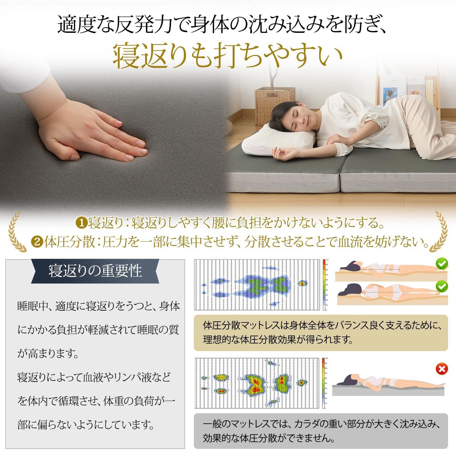 【極厚10cm・復元率98%超え】極厚の10cm仕様で、しっかりとした厚みとクッション性を備えており、床に直接敷いても底つき感なく快適にご使用いただけます。復元率98%以上の高反発ウレタンを採用しており、優れた反発力で理想的な寝姿勢を。 強く押してもすぐに元の形に戻る弾力性があり、身体をしっかり支えて沈み込みすぎを防ぎます。また、硬めのしっかりとした寝心地で、体全体をしっかり支えるため、寝返りが打ちやすく、腰への負担も軽減。 快適な睡眠環境を実現します。