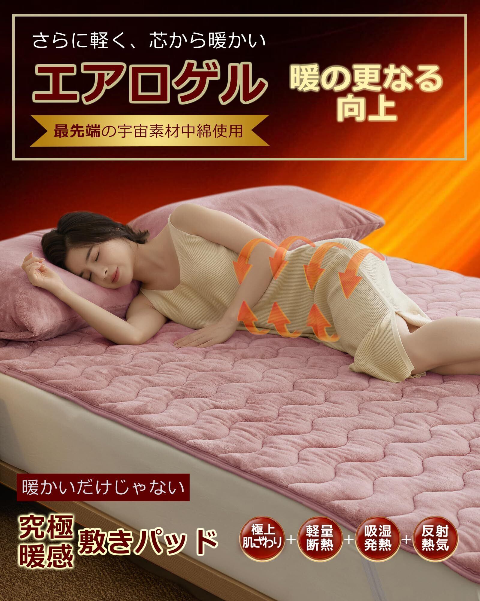 【寒い冬対策究極暖感あったか敷きパッド!!!】寒い冬を乗り切るために、快適な生活と省エネを目的に、弊社はこの蓄熱保温の多層冬用敷きパッドを作りました。寒い冬に掛けた瞬間から心地よい温かさと肌触りを実感できます。第1層は高密度のマイクロファイバーフランネルを採用します。第2層は蓄熱発熱機能付きの中綿です。第3層は最も断熱と驚くほど軽い宇宙素材エアロゲルを用いた中綿を使用します。第4層は超断熱素材アルミシートで、あったか敷きパッド内の暖気を閉じ込め、床からの冷気をしっかりブロックします。第5層はリサイクスピーチ素材を使用し 『ご注文前にご確認ください』本品は「敷きパッド シングル 冬 100x205cm」「ピンク」です