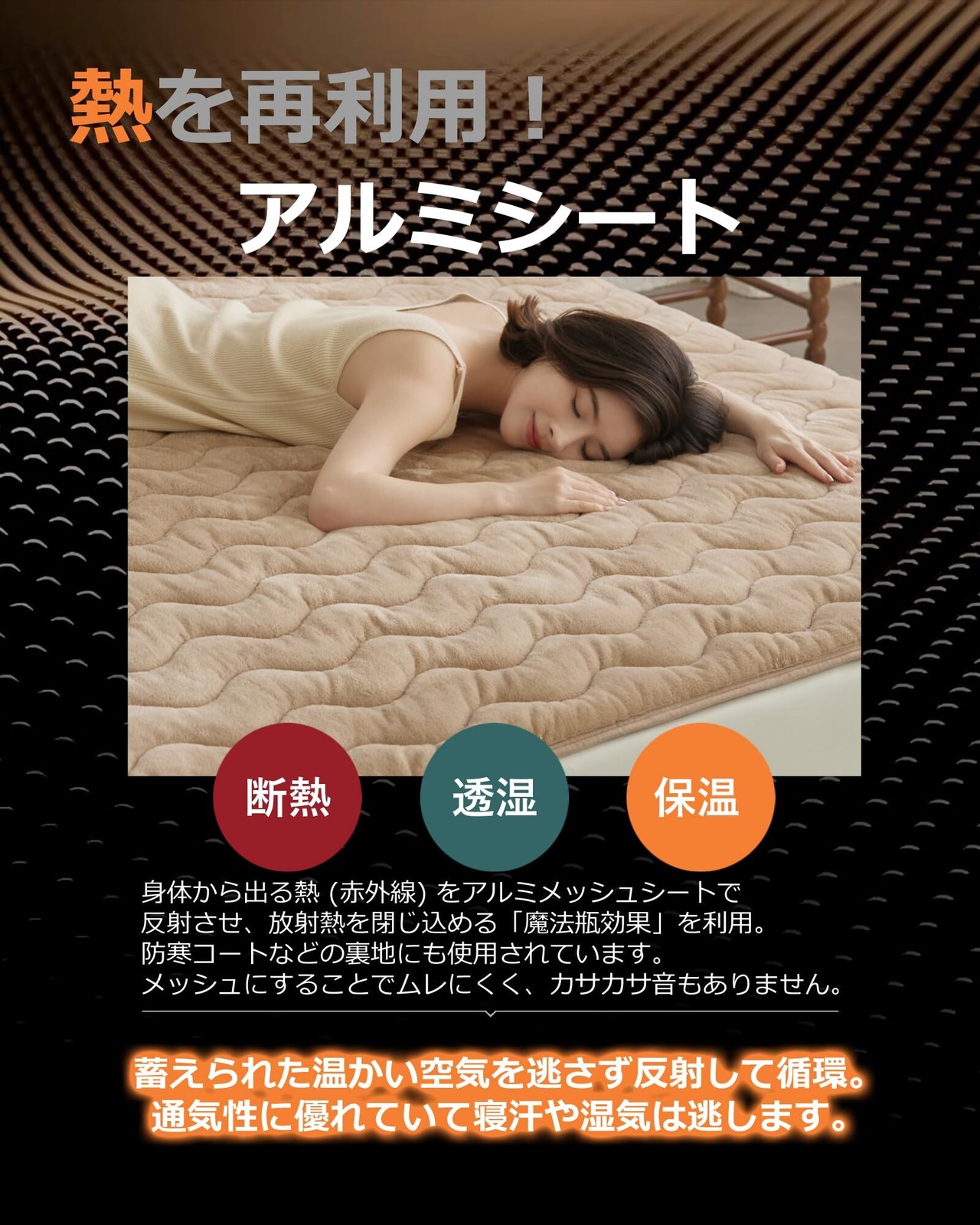 【しっかり断熱素材のアルミシート】暖かさを逃がさない遮熱アルミシートを使用します。アルミシートの断熱効果で冷たい空気をシャットアウトし、発熱する中わたが生み出した温かさを、しっかり敷きパット内に閉じ込め、冬用敷きパッド内の暖かな空気を逃がしません。さらに、新しい特殊技術で、アルミシートは音がしなく,夜の時間の長い秋冬こそ、ぬくぬくとした敷パットで快適な睡眠をとりたいものです。