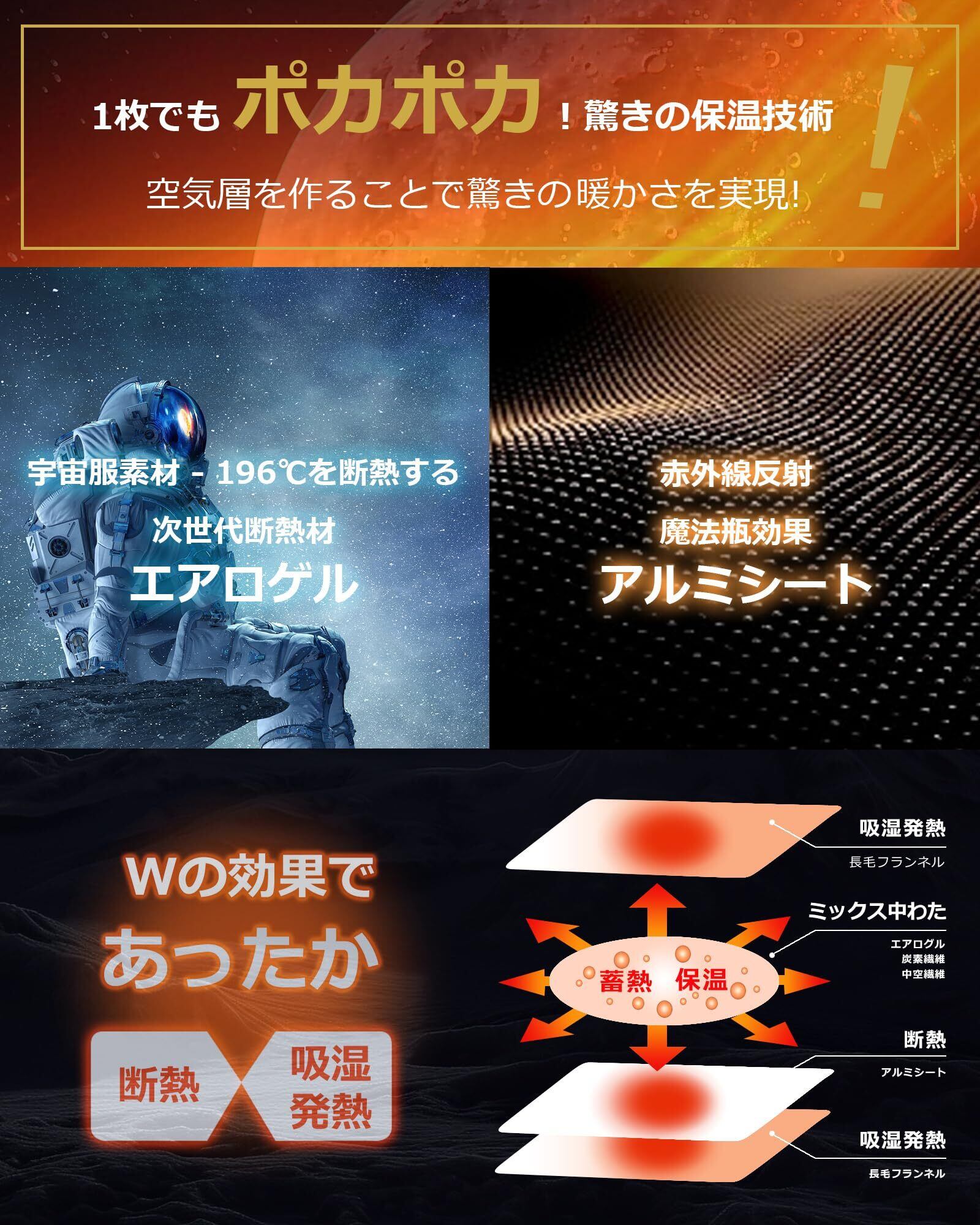 素材構成 [接触温感]フランネル 「蓄熱保温」Easywarm中綿 「超断熱」エアロゲル中綿「冷気遮断」アルミシート