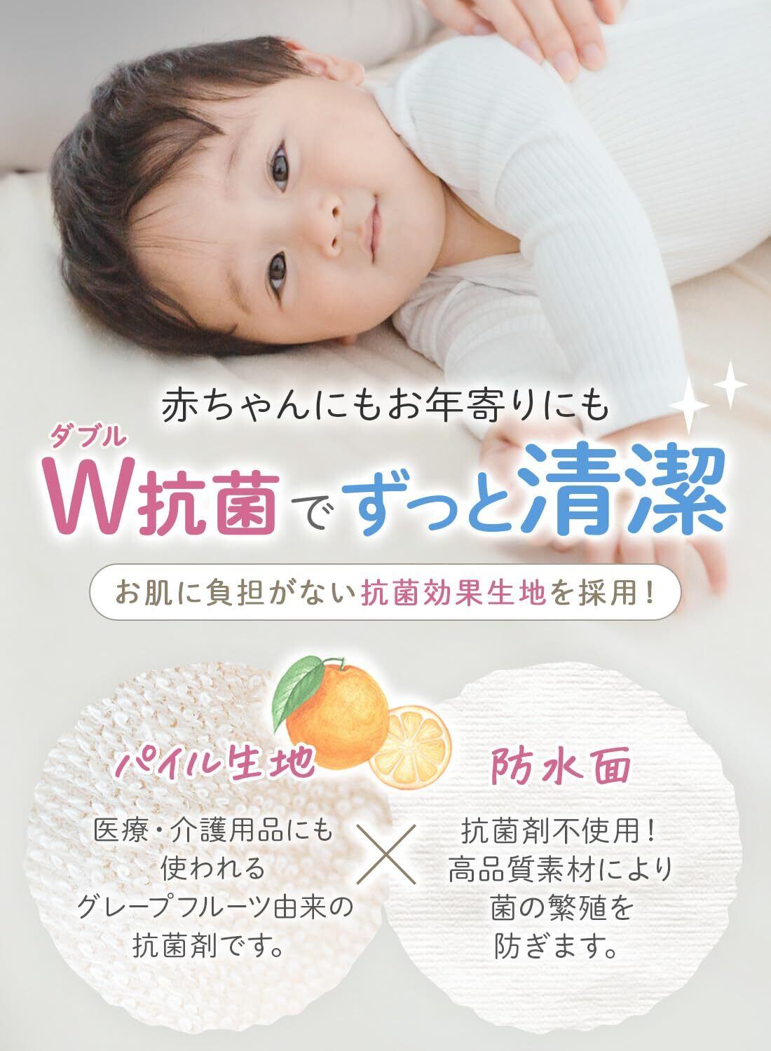 【からだに優しいダブル抗菌】お肌が触れるパイル面にはグレープフルーツから抽出した、医療・介護用にも使われる安全性の高い天然由来成分の抗菌剤を使用。防水面は抗菌剤不使用で、高密度素材により菌の繁殖を抑えて、ダニの侵入もシャットアウトします。いつでも清潔に気持ちよくお使いいただけます。