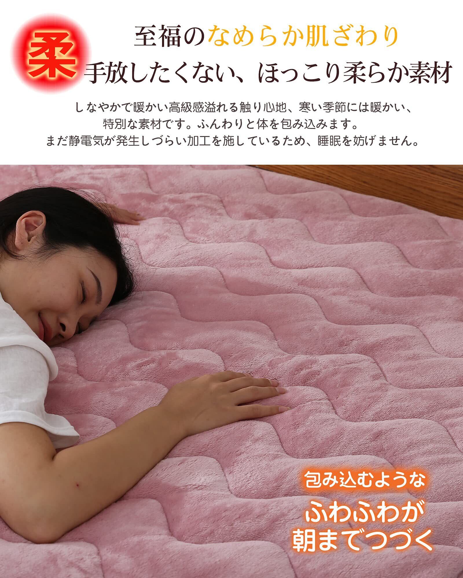【肌触りと温感機能に優れたフランネル表地】極細マイクロファイバーによる高密度起毛処理で、肌に触れた瞬間から「ひんやり感」を軽減します。繊維間にできる空気層が自然な保温効果を生み、接触温感機能によってすぐに温かさを実感できる敷パットです。従来の冬用敷きパッドを上回るふんわりとした柔らかさとなめらかな肌触りが特徴で、デリケートな肌の方や乳幼児でも安心してお使いいただけます。布団に入った瞬間、思わずため息が出るほどの心地よさで、寒い季節の夜が待ち遠しい時間に変わります。