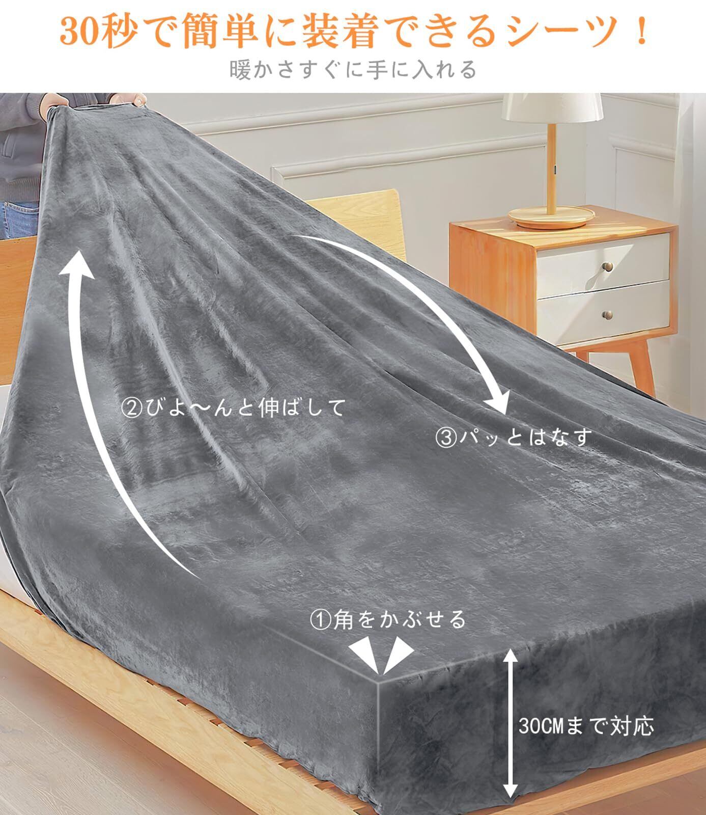 ボックスシーツがシングル 100×200cm・セミダブル 120×200cm でマチ部分約 30cm、ベッドカバーは極細繊維が空気を保持して暖かく繊維密集で柔らかくシルクのような肌触りと光沢があるフランネル生地で、敷き布団カバーは裏面全周ゴム入りでズレにくくストレッチ性で着脱簡単且つマットレスや和式布団、極厚敷布団に対応し、静電気防止加工で秋冬も安心使用でき、家庭で洗濯可能で清潔なふわふわ触感を楽しめる(但し洗濯機使用時はネットに入れ、乾燥機不使用、塩素系漂白剤使用避け)ものです。