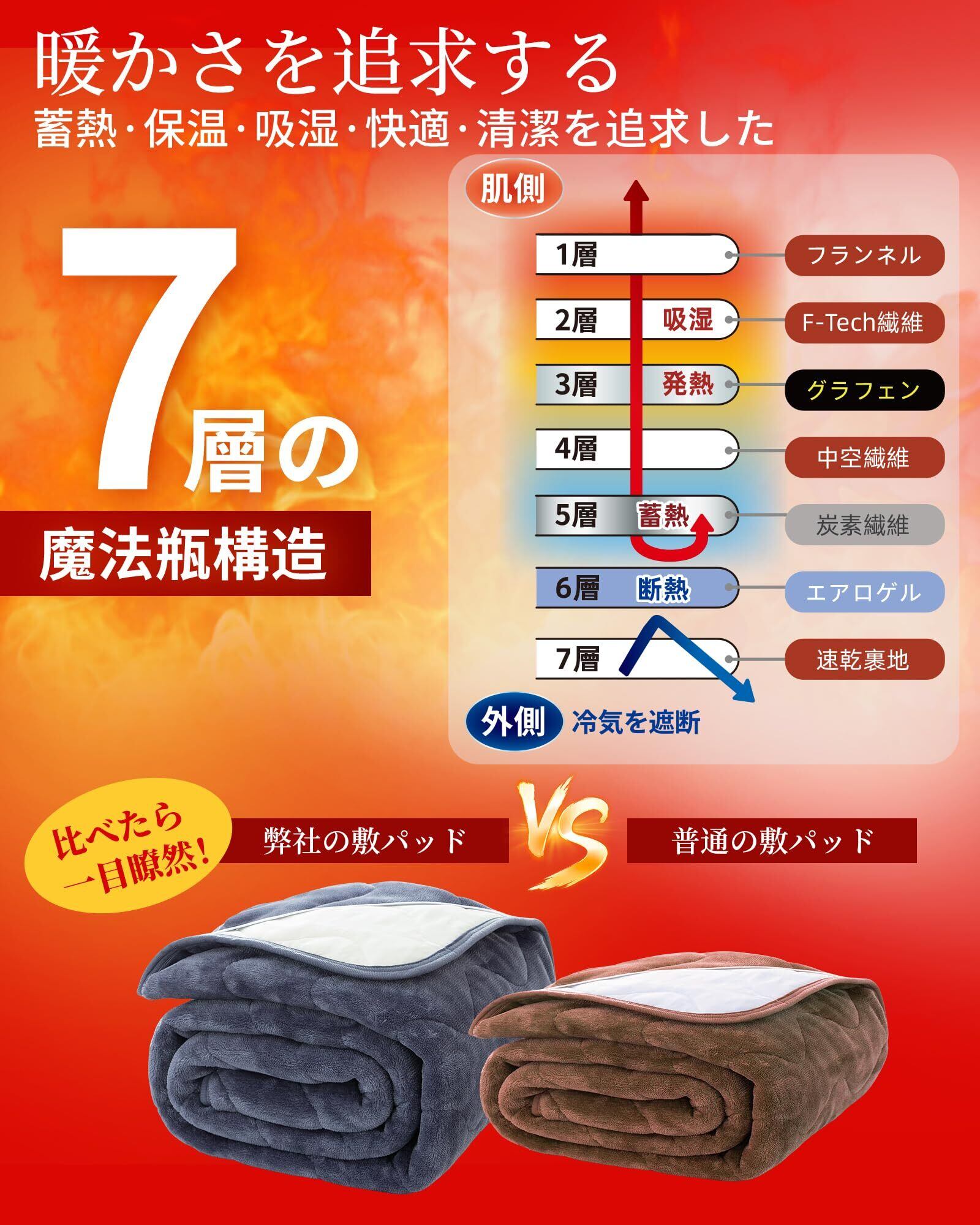 【暖かさを追求する7層構造・ボリューム感たっぷり】敷きパッドの表地には、繊細なマイクロファイバーを使用しており、なめらかでふわふわの肌触りです。第二層は吸湿発熱綿「F-Tech」、第三層はグラフェン発熱層、第四層は中空綿でふっくらとした厚みを持たせています。第五層は碳素纤维蓄热层、第六層はエアロゲル断熱層、第七層は通气速干裏地です。吸湿発熱素材が湿気を熱に変え、グラフェンがその熱を放射し、エアロゲルが外部の冷気を遮断する——この三重メカニズムとたっぷりの中わたにより、暖かさをしっかりキープ。寒い冬の夜でも底冷えせず、朝まで快適にお過ごしいただけます。 毎日、暖かいシーツに包まれる瞬間が待ち遠しくなる——そんな極上の肌触りとぬくもりを、ぜひ体感してください。