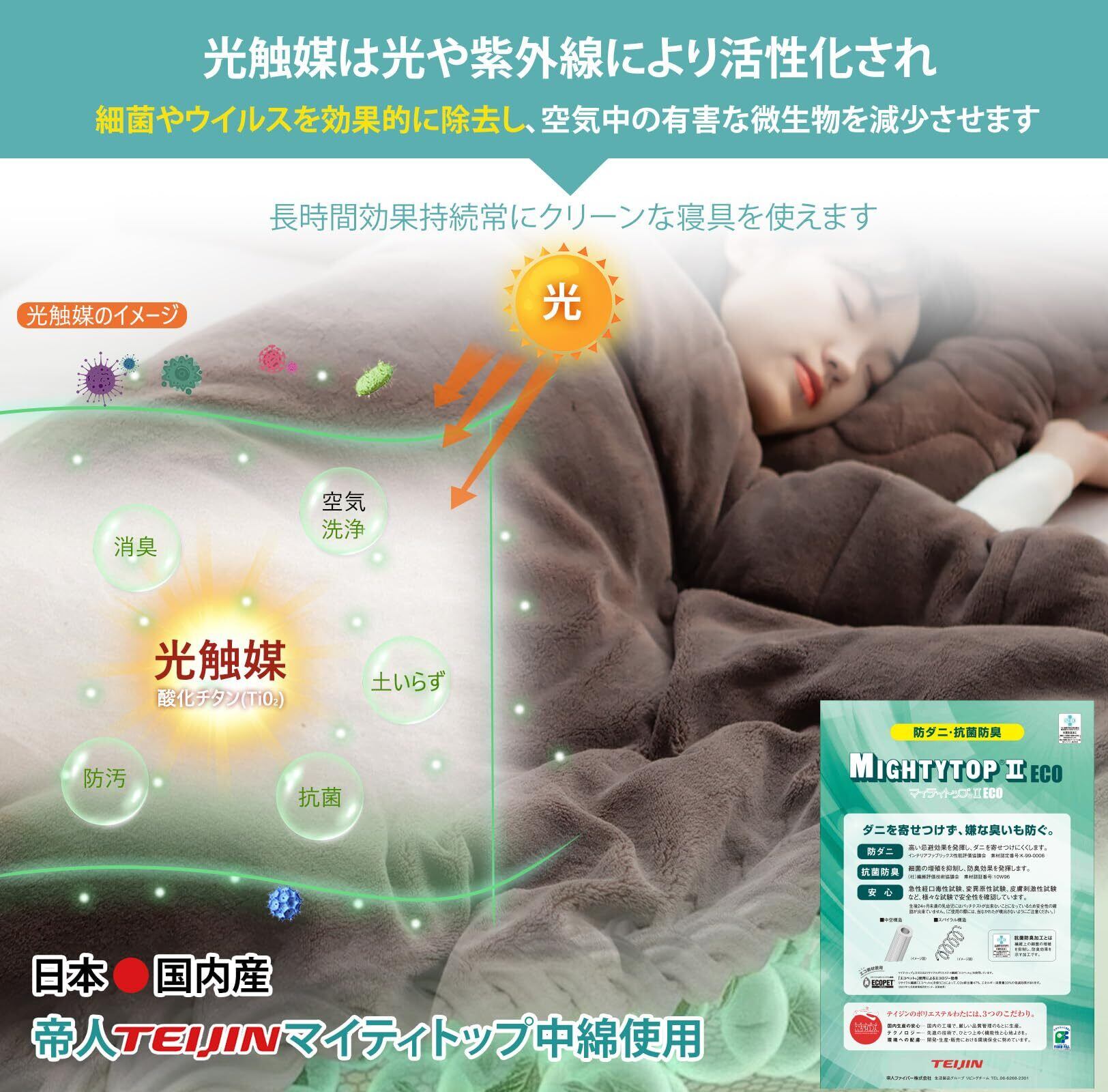 【ダブル抗菌防臭】この毛布には、帝人の「マイティトップⅡECO」抗菌防臭・防ダニ中わたを使って、光触媒加工が施されており、細菌やウイルスの除去、臭い分子の分解を通じて、清潔で快適な環境を保ちます。高い忌避効果でダニの繁殖も防ぎ、小さなお子様にも安心してご利用いただけます。