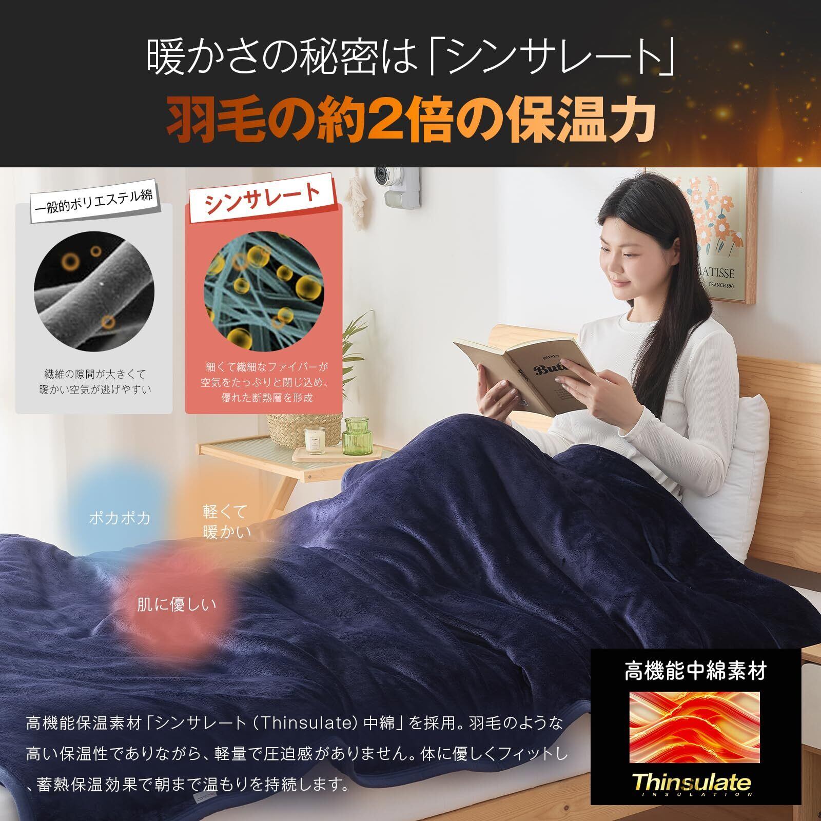 ✨【温かさの秘密:シンサレート中綿】毛布の中綿には、空気を多く含み熱を逃がしにくい特性を持つシンサレート中綿を使用しています。シンサレートの高機能中綿素材には、羽毛の先とほぼ同じ細さのマイクロファイバーが使われており、複雑に絡み合った微細な繊維の間に大量の空気を閉じ込めることが可能です。そのため、冷えやすい朝や寒い夜でも、長時間にわたって快適な温かさを保ちます。