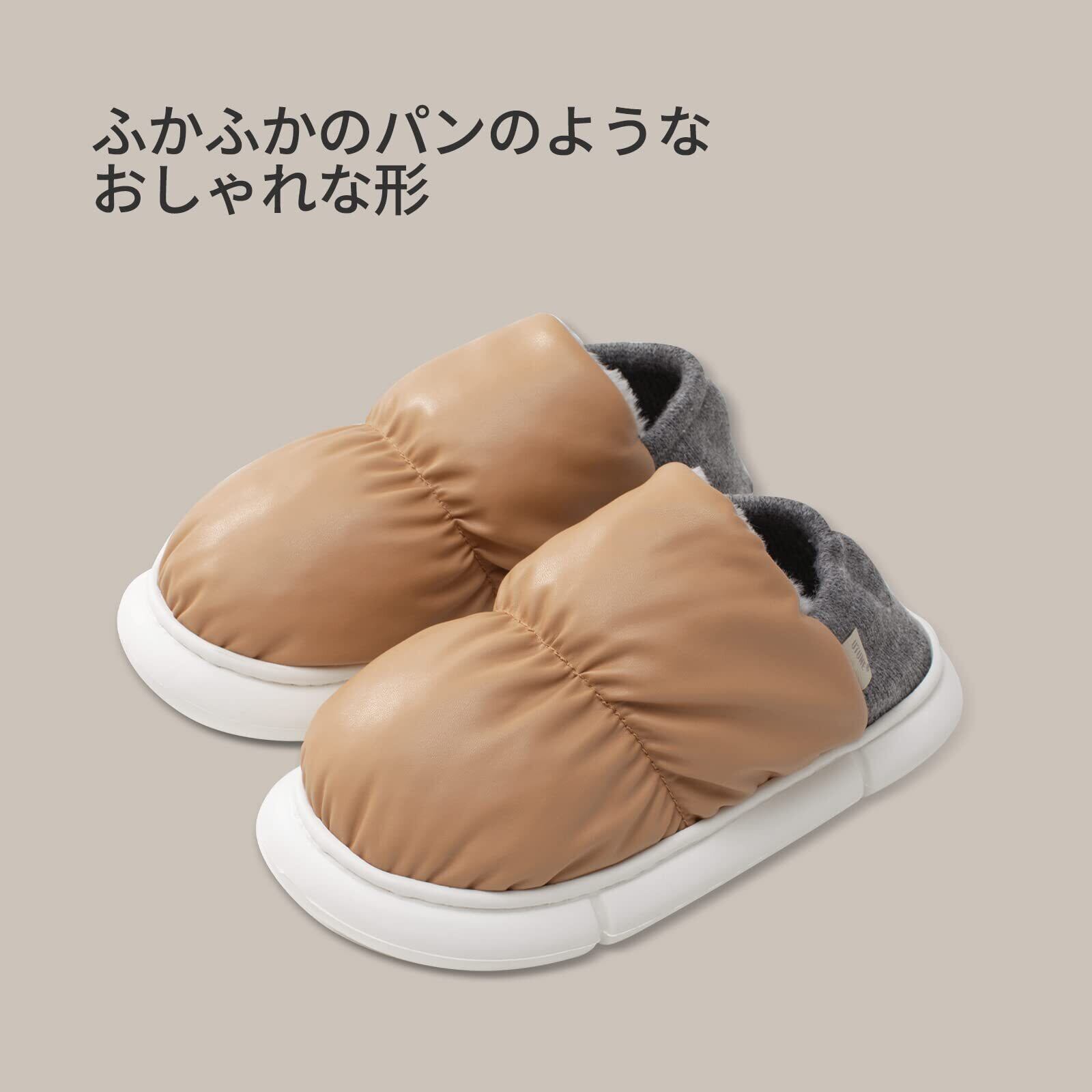 冬になると、もふもふ、ふわふわ、ぬくぬくのスリッパがいつも人気が高いでございますが、「汚れてしまうと綺麗にするのは難しい」と心配されているお客様もいらっしゃるかと存じております。 そのため、UTUNEは、甲に防水性に優れてお手入れも簡単なPU、ソールに同じく水や汚れに強いEVA素材、ライニングにふかふかで肌触りが柔らかなボアを採用しておりました。この靴と同じような暖かくてふかふかのパンから形のインスピレーションが得られて、こちらのおしゃれな冬用レザースリッパを開発いたしました。