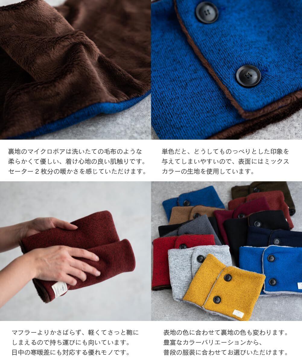 【ずっと着けていたいほどの優しい肌触り。-抗菌ボアでいつでも清潔なネックウォーマー-】柔らかく、優しい着け心地な1枚。肌に直接触れるものだからこそ、ストレスなく快適なものを選びたい。そう思い、裏地にはマイクロボア素材を使用しました。洗いたての毛布のようなフワフワした肌触りで「セーター2枚分の暖かさ」と言われています。そのため、寒さの厳しい毎日も暖かく過ごしていただけます。毎日使って欲しいから、いつも清潔に着けていただけるよう”抗菌・防臭”加工が施しております。マイクロボアはチクチクすることなく、軽く、丁度良い厚み。その為、ストレスを感じることなく使っていただけます。通勤通学や、アウトドア時、あらゆるシーンで使っていただける1枚です。