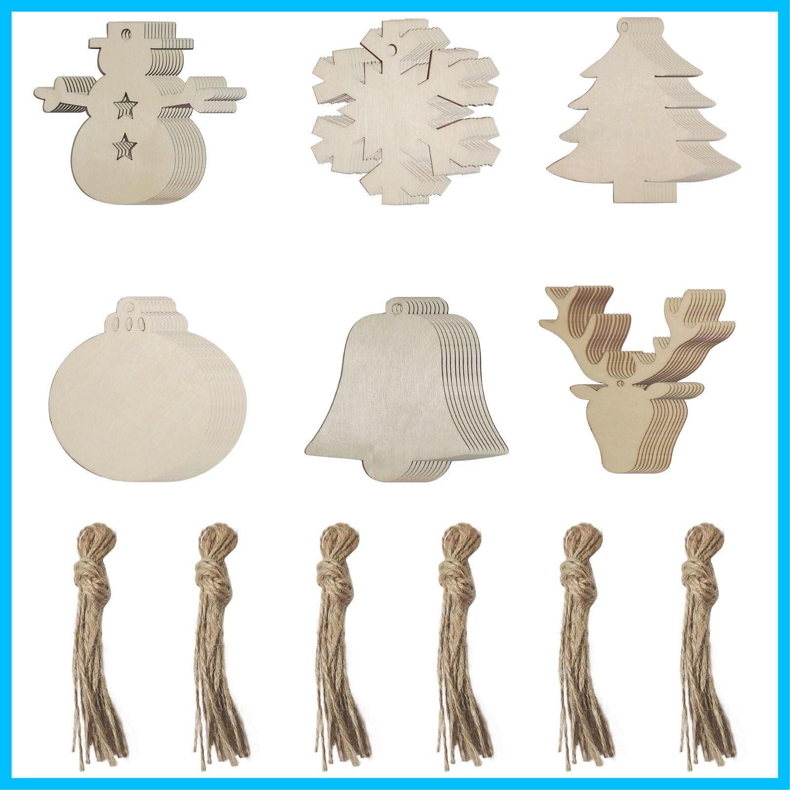 クリスマス オーナメント 木製 60個セット 雪の結晶 雪だるま トナカイ ベル 木材チップ スライス ペンダント クリスマスツリー オーナメント 北欧 クリスマス 飾り 装飾 ギフトタグ 麻紐付き | Lulu