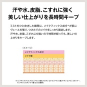 ① 汗や水、皮脂、こすれに強く 美しい仕上がりを長時間キープ ミストをひと吹きした瞬間に、メイクフィックス成分*1配合のきめ細かいミストが肌にヴェールを張り、崩れの原因を防いでつけたてのメイクをキープします。 汗や水、皮脂、こすれにも強いので時間が経っても、美しい仕上がりをキープします。