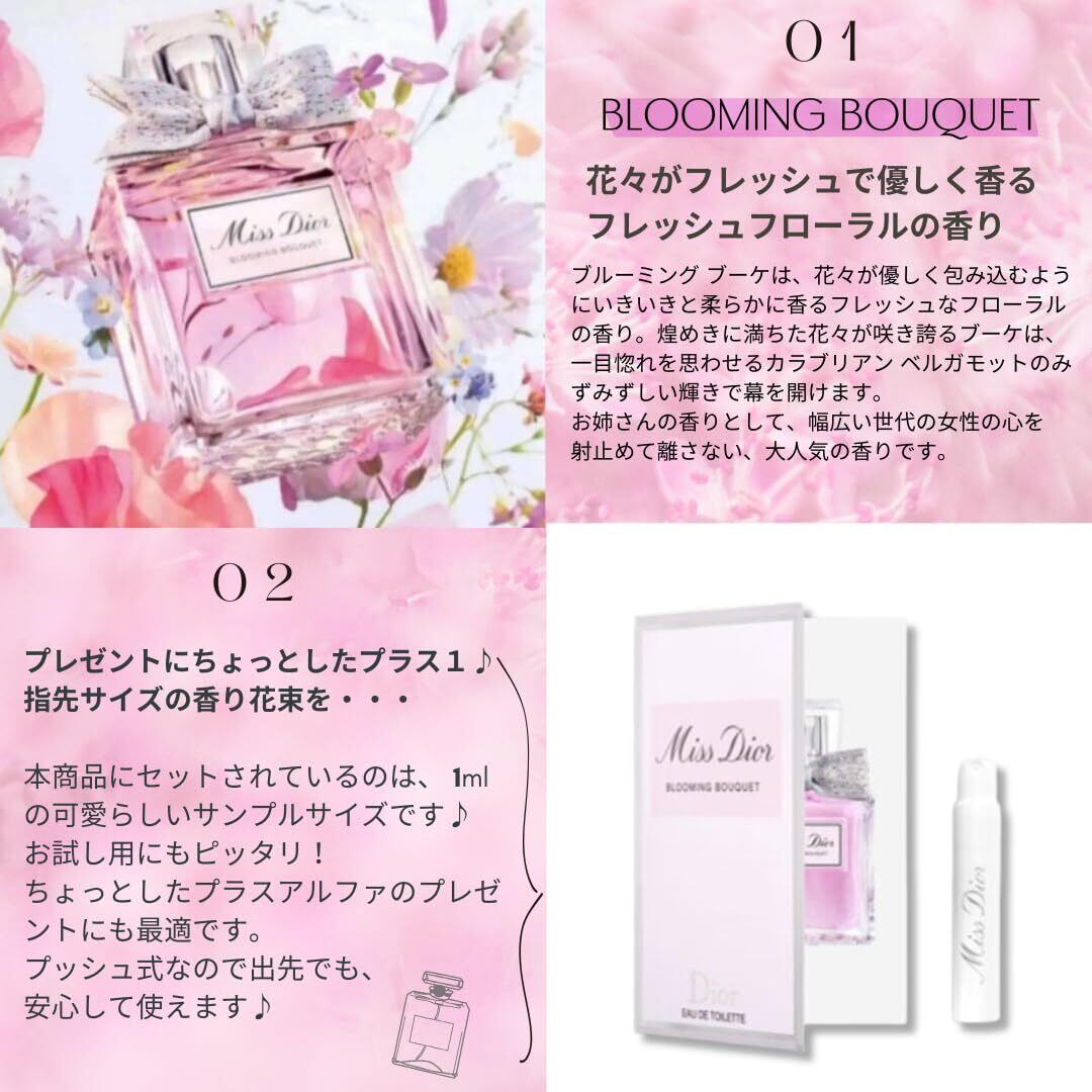 ️【セット内容】①Miss Dior ブルーミングブーケ EDT 1ml(トライアルサイズ) ②CDロゴキャンバスピンク巾着ポーチ③FREADIA ハイエンドモデル アトマイザー(5ml容量、飛行機OK)④ブーケ柄メッセージカード(KASANE)