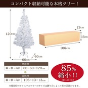 【商品詳細】内容量:クリスマスツリー、土台、ねじ3本。サイズ:高さ120cm。収納後の箱の大きさ:106cm×13cm×13cm