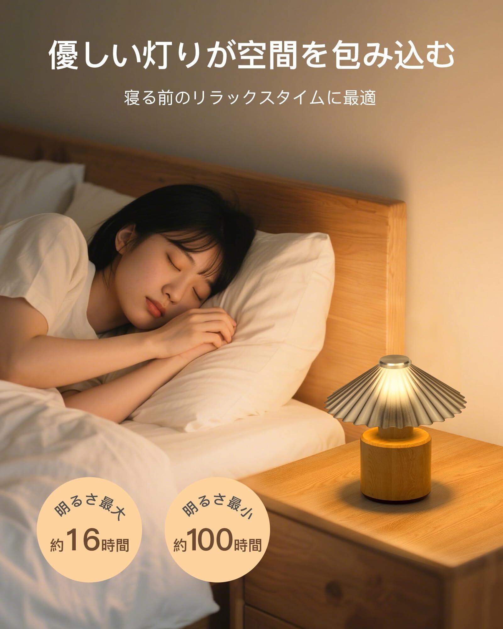 【USB充電式・コードレスで自由に配置】USB-Cポート対応の充電式バッテリー内蔵で、面倒な配線が不要。フル充電で最大約100時間連続使用可能。コードレス設計により、ベッドサイドや書斎、ダイニングなど、どこにでも自由に設置できるナイトライトです。