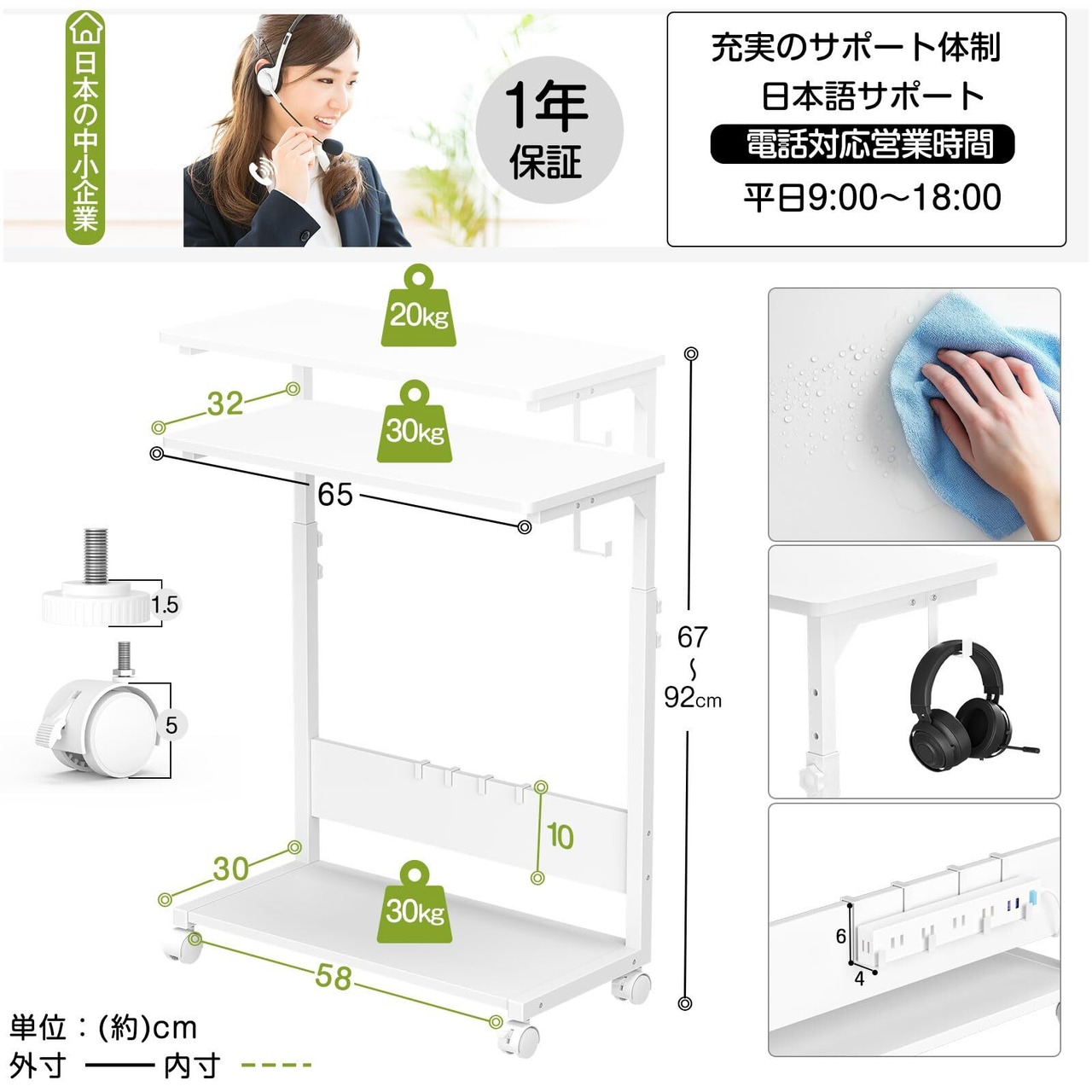 [天板高さ6段階調整]天板の高さを62cm~92cmの間で6段階調節可能なパソコンラック。ベッドサイドテーブルやソファ横テーブルとして、またL字デスクの拡張やゲーミング移動テーブル、キーボードマウス用サブデスクなど、様々なシーンに合わせて変身します。最小高さ62cmでコンパクト収納可能な一方、最大92cmにすればスタンディングデスクとしても活用でき、作業スタイルに合わせて自由にレイアウトを変更できます。