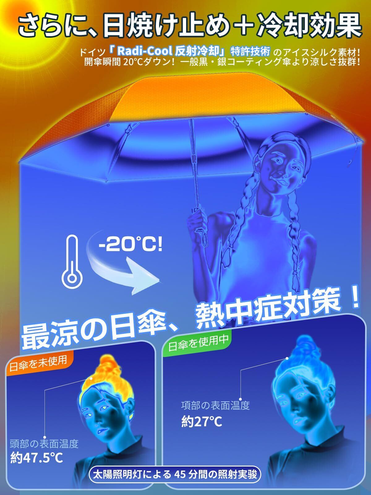 【JIS認証日傘・100%UVカット・100%遮光遮熱】UPEBの折りたたみ日傘は、一般の基準を100倍上回るJISの専門認証を獲得しています。日本の国家規格、JIS規格1925にてUVカット率100%を実証。JIS規格1055にて遮光率100%の実証済み!完全遮光の最高級日傘です。徹底的なUVカット率100%へのこだわり、厳しい暑さや日焼けから肌を効果的に守ります!紫外線A波(肌の深層まで届く)・紫外線B波(肌を赤くする)・紫外線C波、全ての波長の紫外線を100%UVカット!ドイツ「 Radi-Cool 反射冷却」特許技術のアイスシルク素材!開傘瞬間 20℃ダウン!一般黒・銀コーティング傘より涼しさ抜群!『涼しさを持ち歩ける』大人気の折りたたみ日傘です。