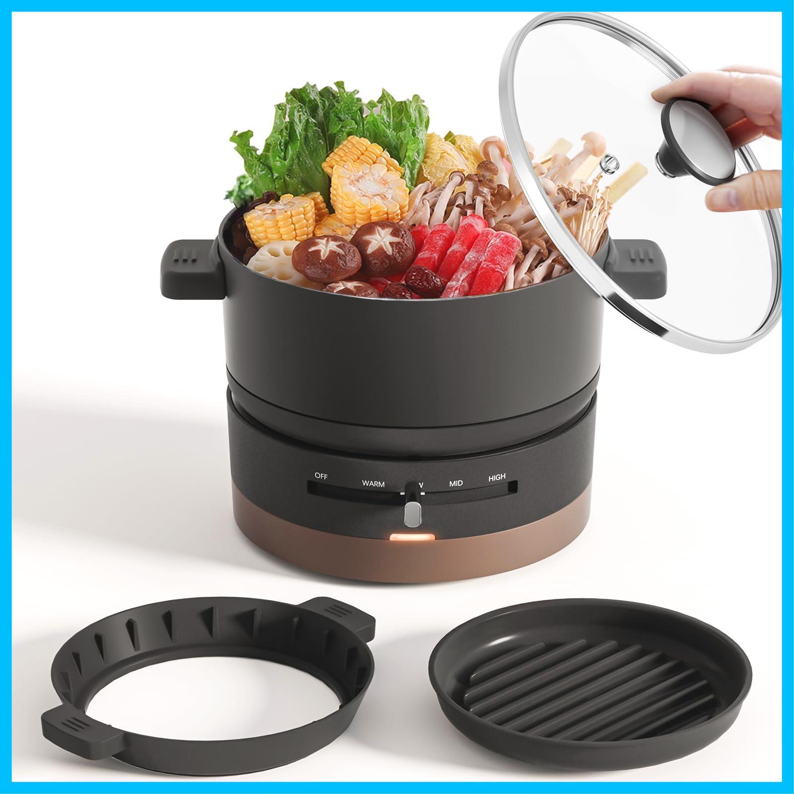 【1台多役】 電気鍋 ホットプレート 一人用 グリル鍋 1L 600W 煮る/焼く/炒める/温める 一人鍋 4段階温度調節 ラーメン 電気調理鍋 着脱式 丸洗い可 ガラス蓋付き 小型 卓上 車中泊 ブラック | Lulu