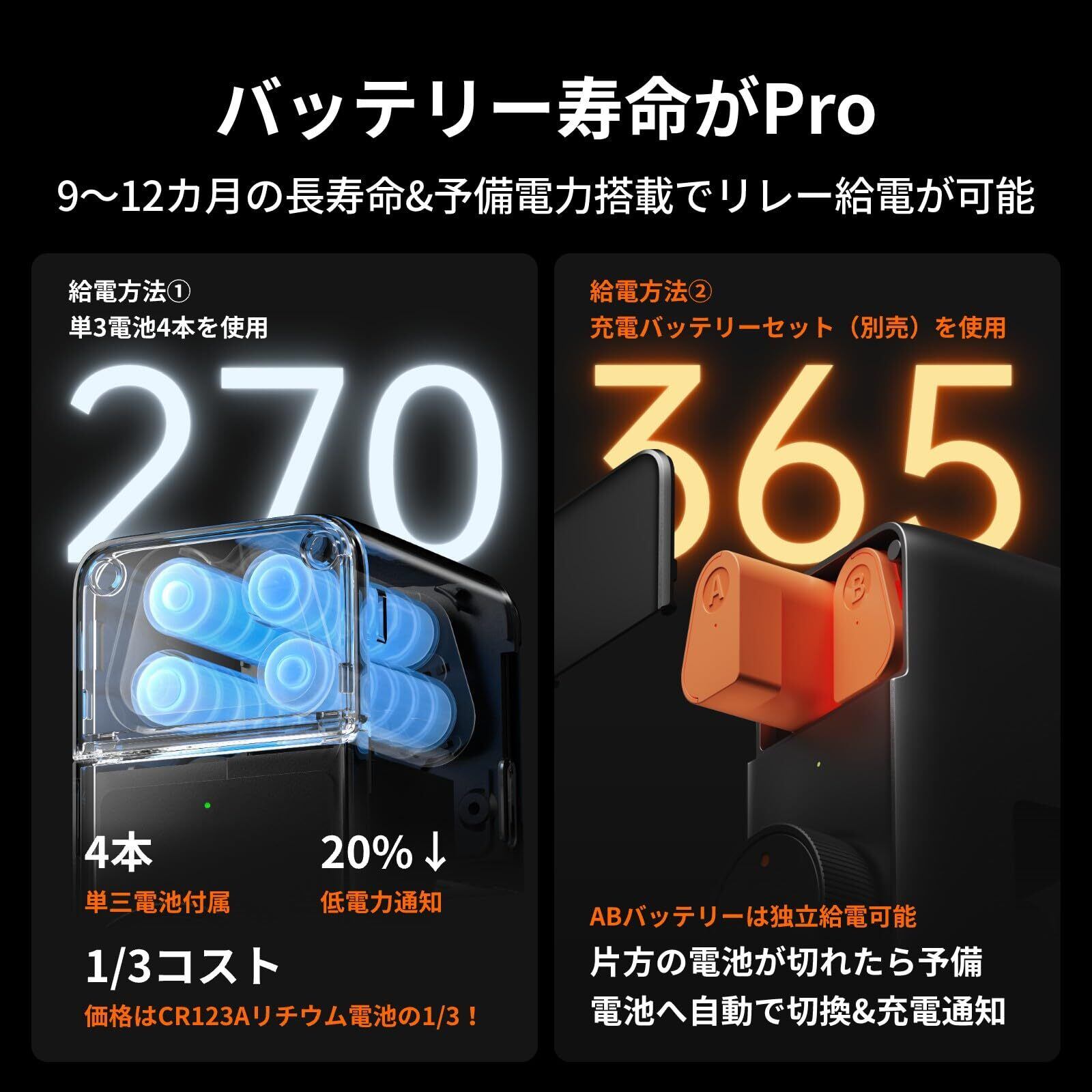 【バッテリー寿命がPro】9~12ヶ月間の長寿命バッテリーを搭載。さらに、メイン/サブ二系統充電式バッテリー(別売り)を利用すれば、メインバッテリーが切れた場合でも自動的にサブバッテリーから給電されます。完全なバッテリー切れによる締め出しの確率を格段に下げることができます。バッテリー切れの悩みを解消したい方におすすめです。