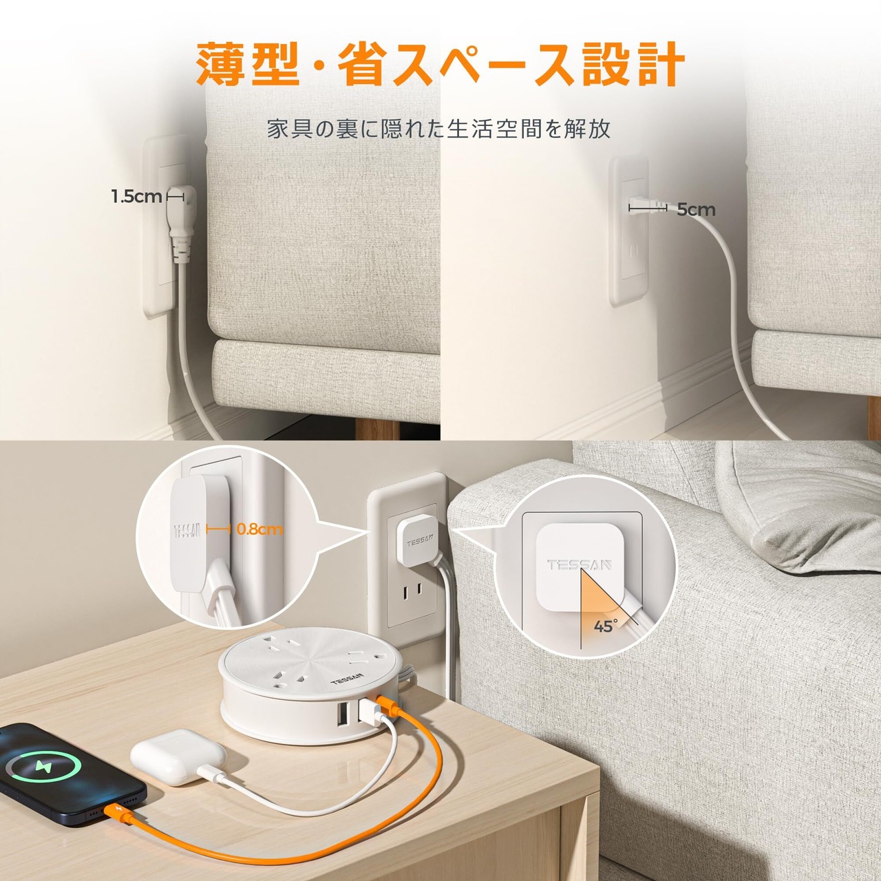 【L字型プラグ コンセント付き】このテーブルタップは薄型プラグを採用しており、厚さはわずか0.8cmと一般的なプラグよりも薄くて、狭いスペースでの使用にも最適です。薄型延長コード隙間なので狭い場所でも配線しやすい。 収納時はコンセントに直接差し込めるので収納が楽になります。