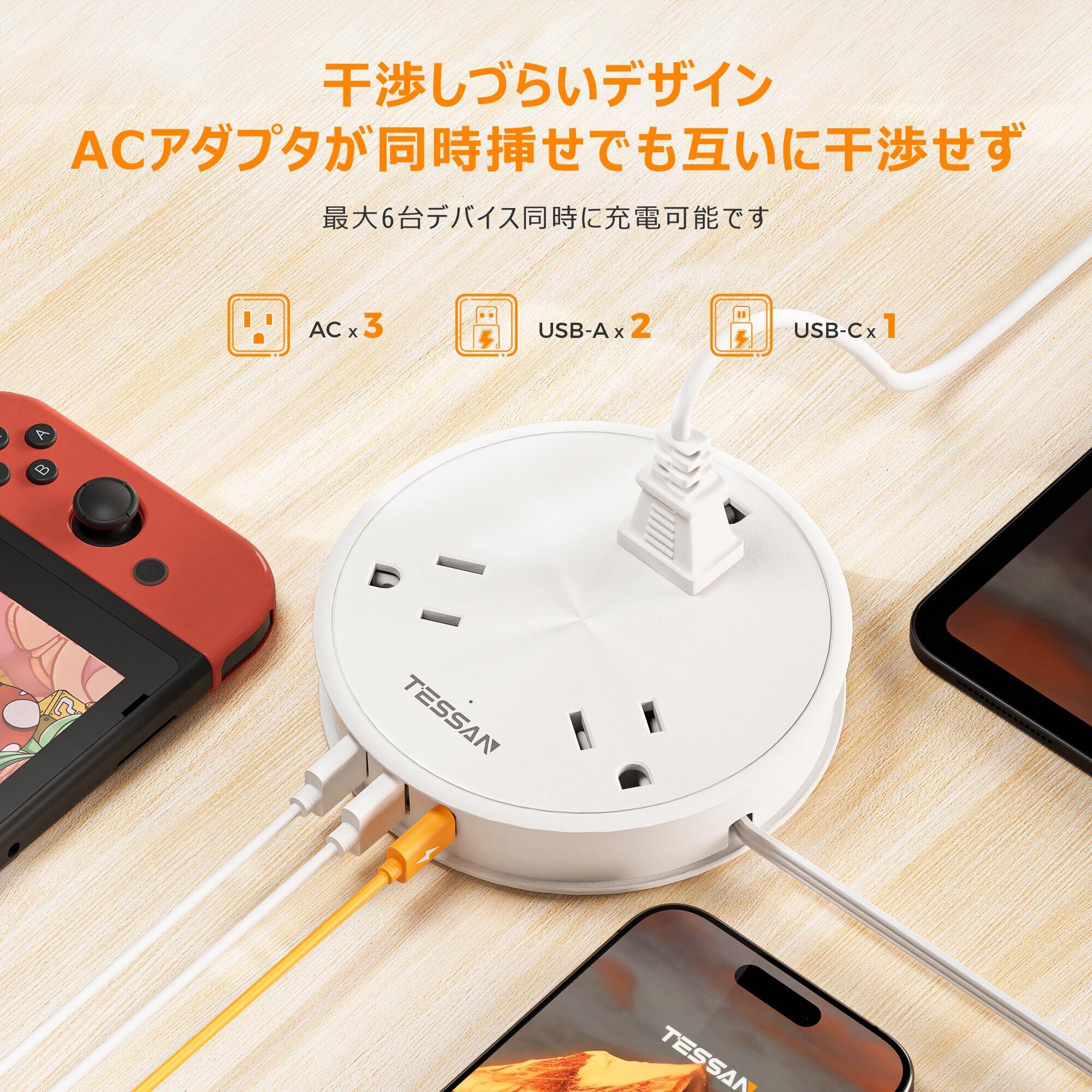 延長コード 短い 薄型プラグ TESSAN 電源タップ usb付き タイプc プラグ コンセント タップ 丸型 巻き取り式 電源タップ 3個AC差込口 1個type-C と2個type-Aポート タコ足配線 テーブルタップ たこあしコンセント 分岐 出張 旅行 2ピンク/3ピン適用 66cm
