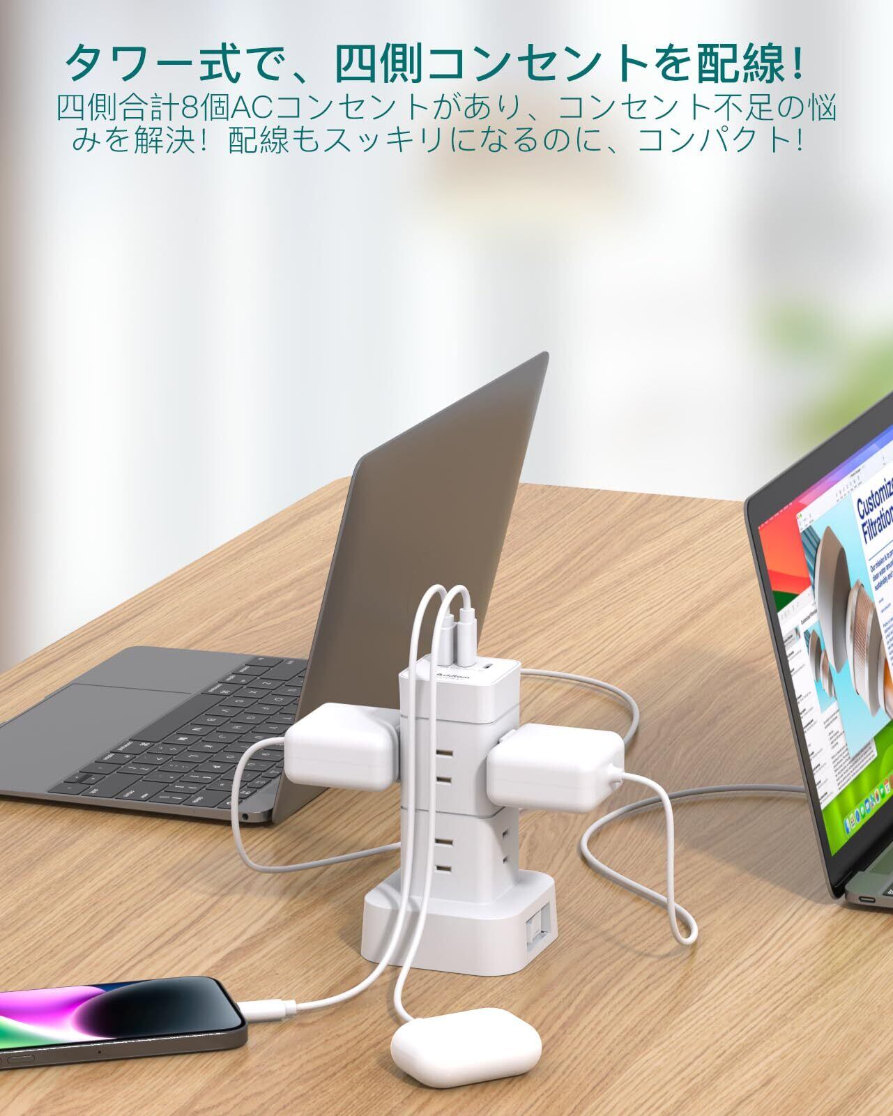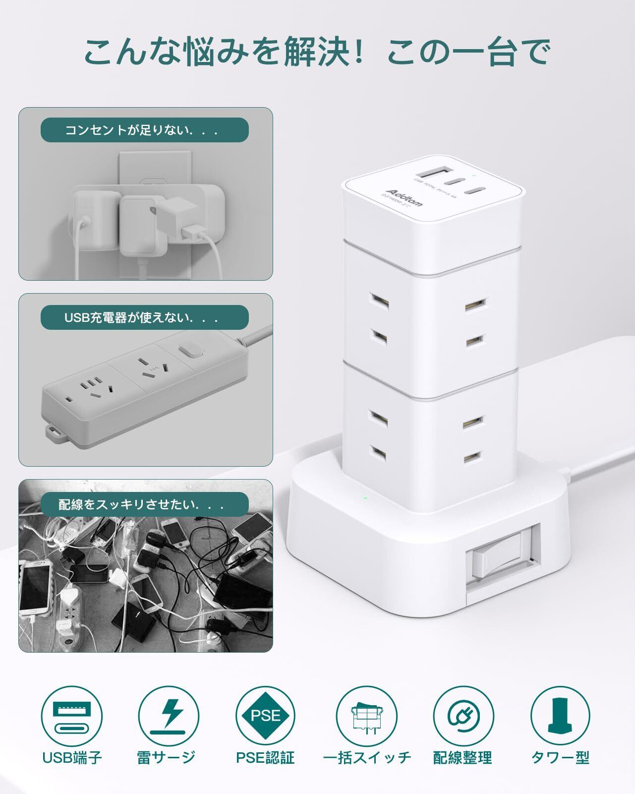 Addtam 電源タップ タワー 2m 延長コード【2025年 コンパクト版】8個AC 3USBポート付き コンセント 一括スイッチ テーブルタップ 蛸足コンセント スマホ充電 マルチタップ OAタップ 雷ガード